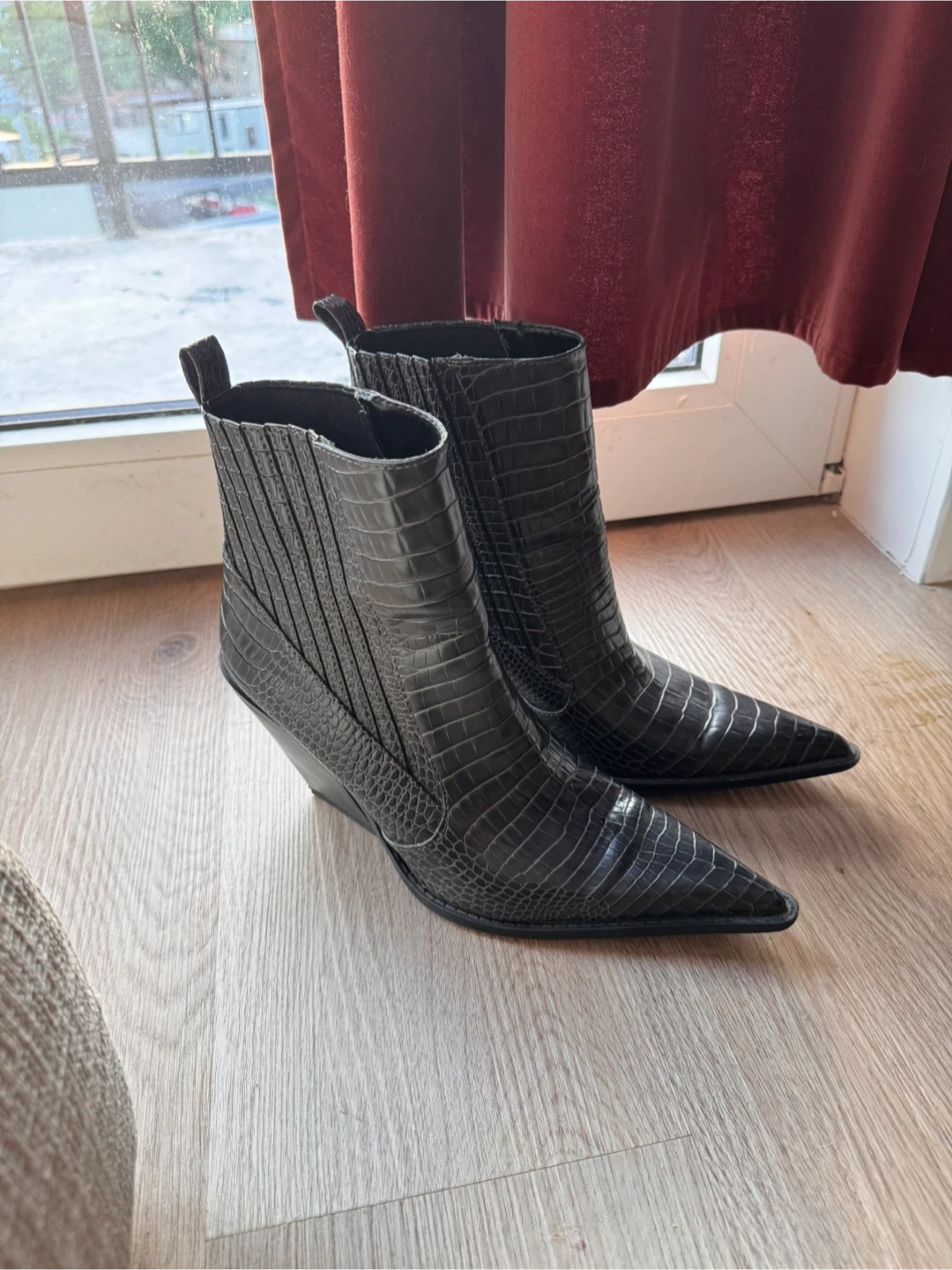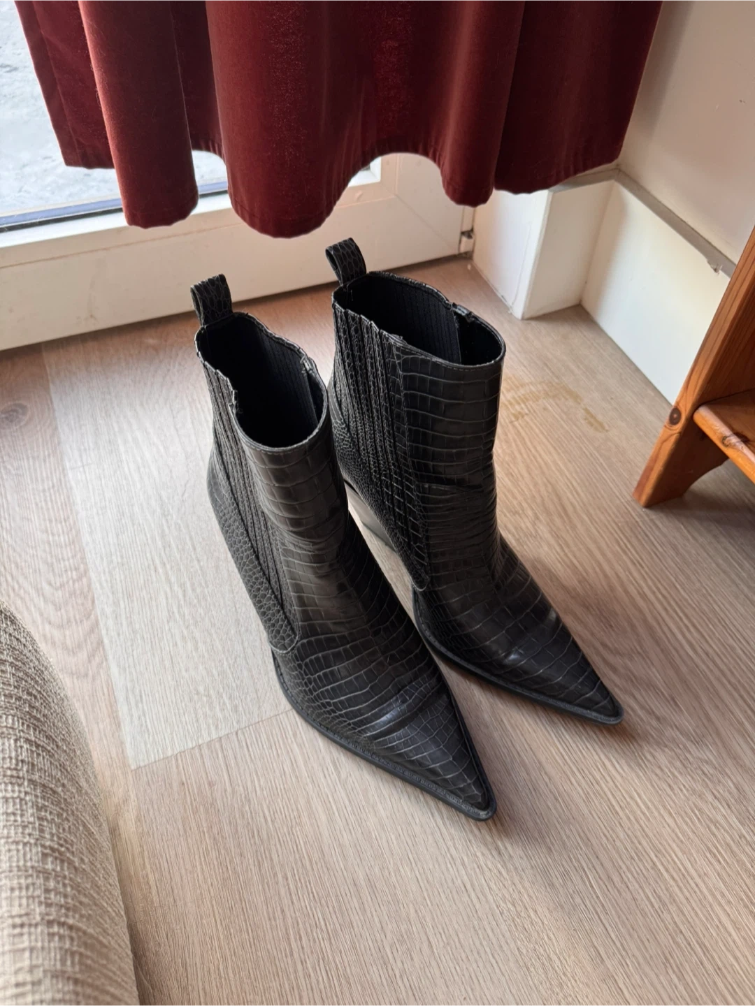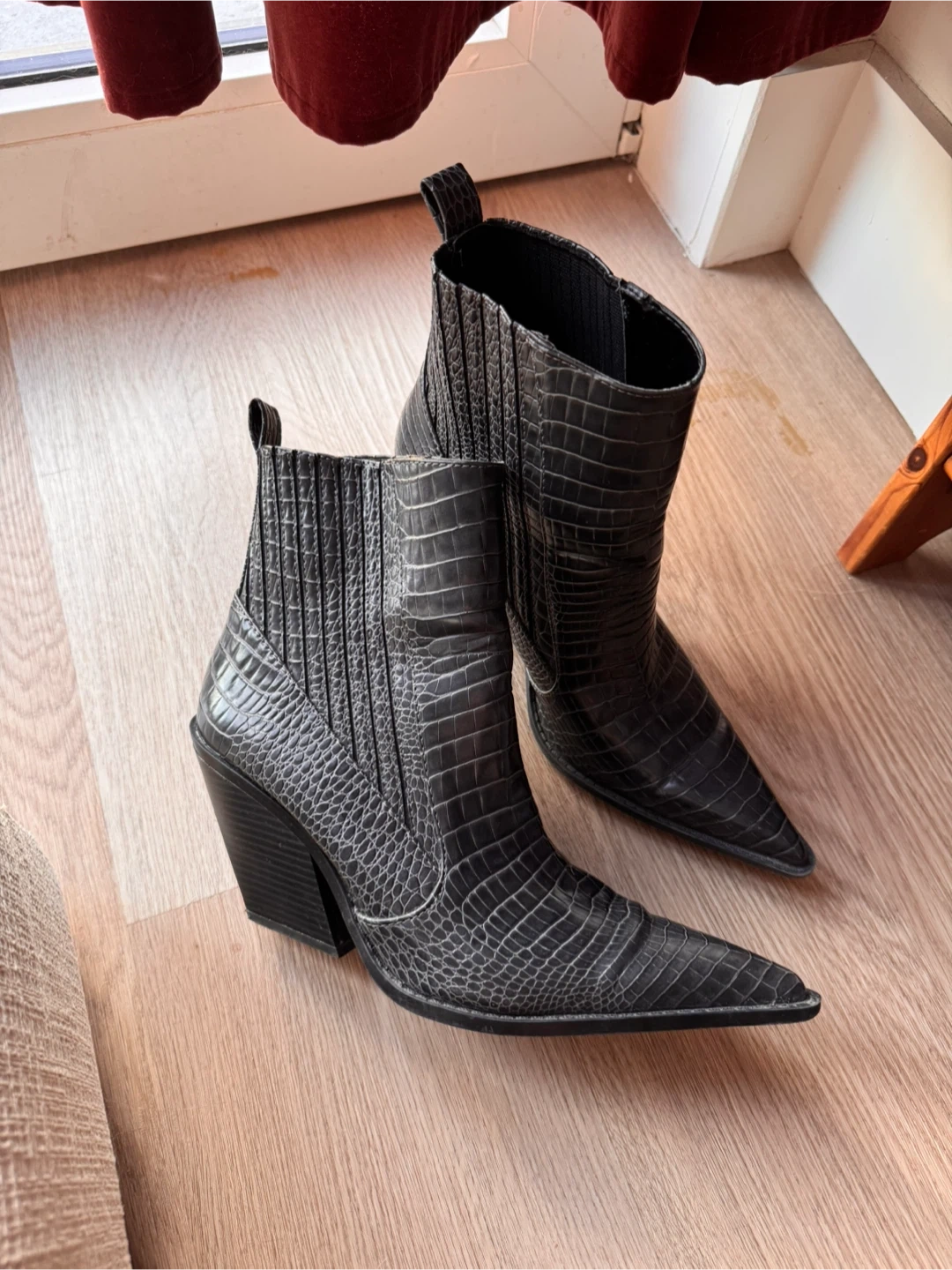 25Stylish Zara heeled boots with a faux crocodile skin texture🐊 Worn two times Size 41 EUR - 10-10.5 US Heel 3.5 inches