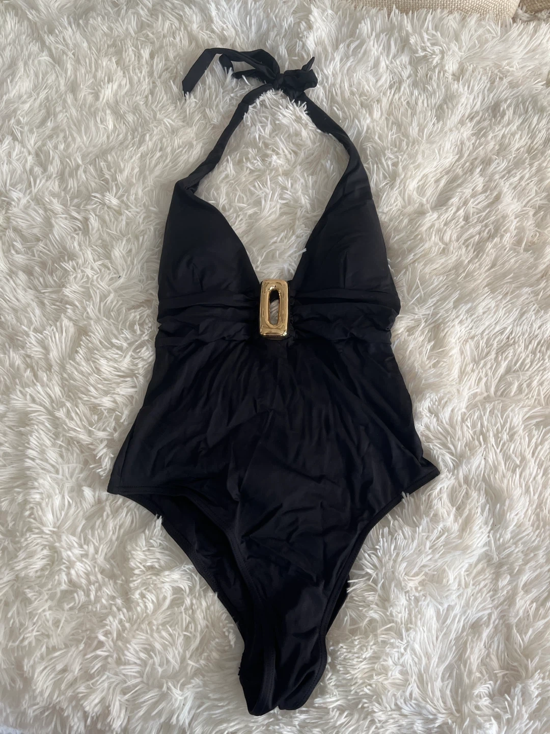 Worn only a couple times! Selling a Zara black halter one-piece swimsuit in size S. It features a stylish design with a gold accent. Perfect for the summer!