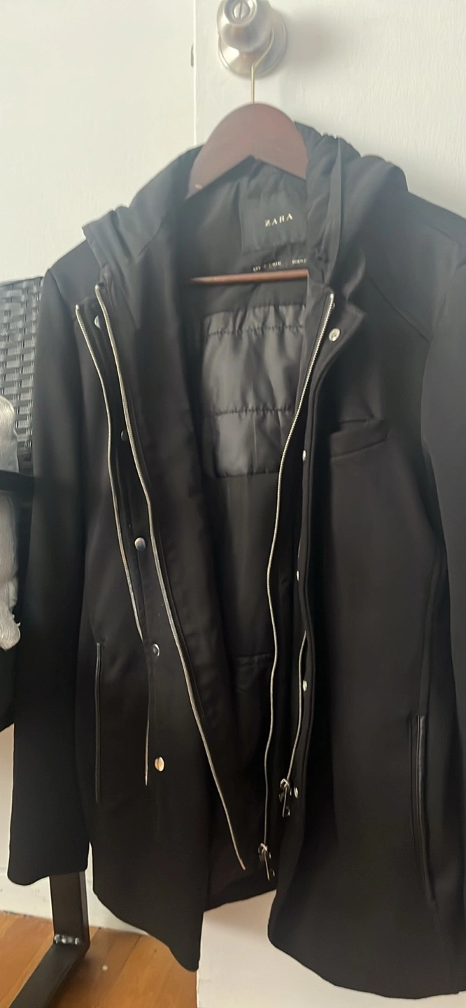 15Selling a Zara woman’s black hooded jacket in size M. It's in great condition and ready for a new home! Perfect for layering or wearing on its own. Removable hood