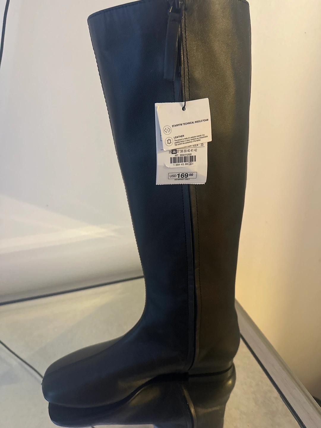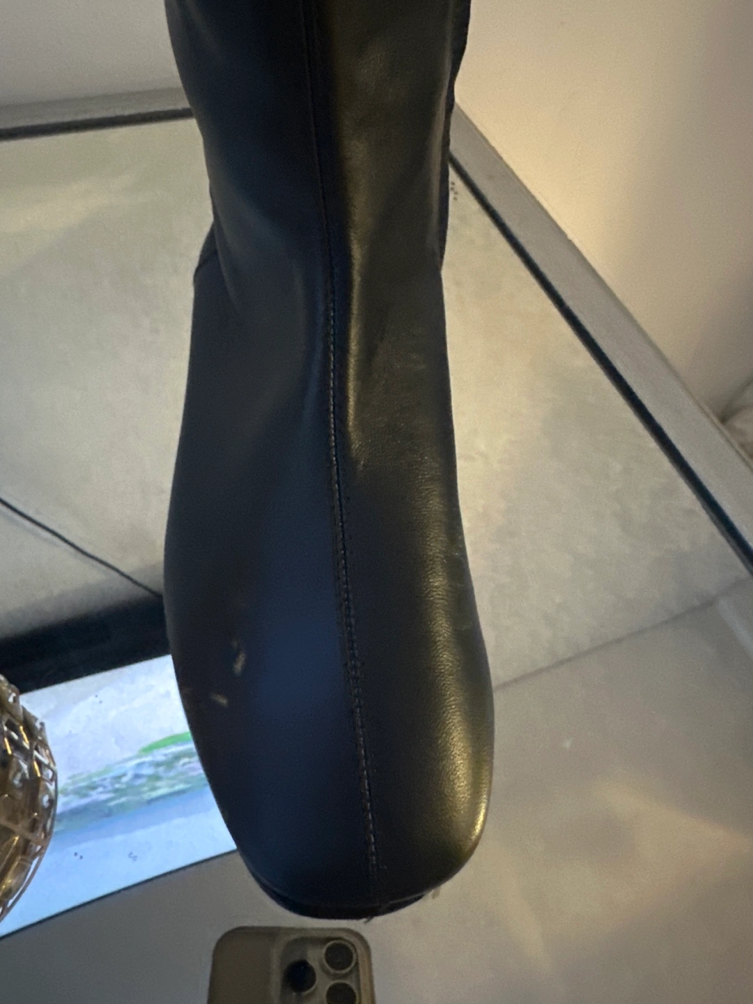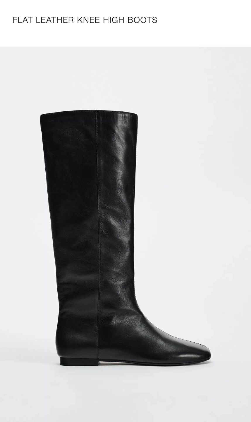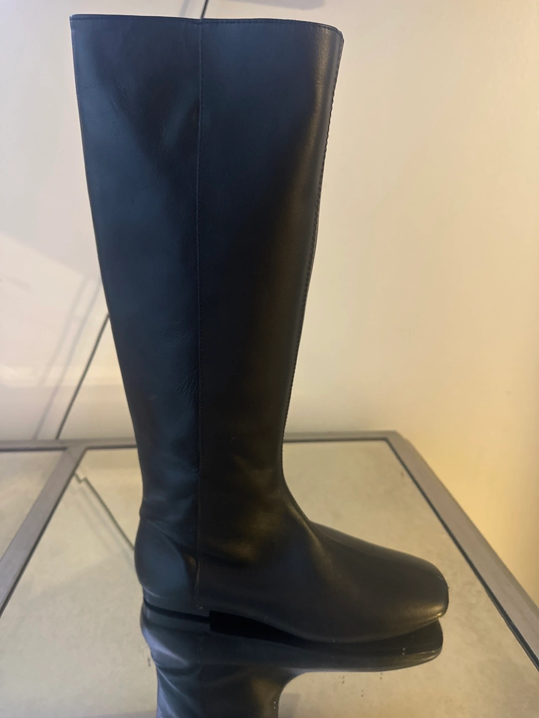 Women's black leather knee-high boots. Flat sole. Slight imperfection visible on one boot. Back zipper closure.