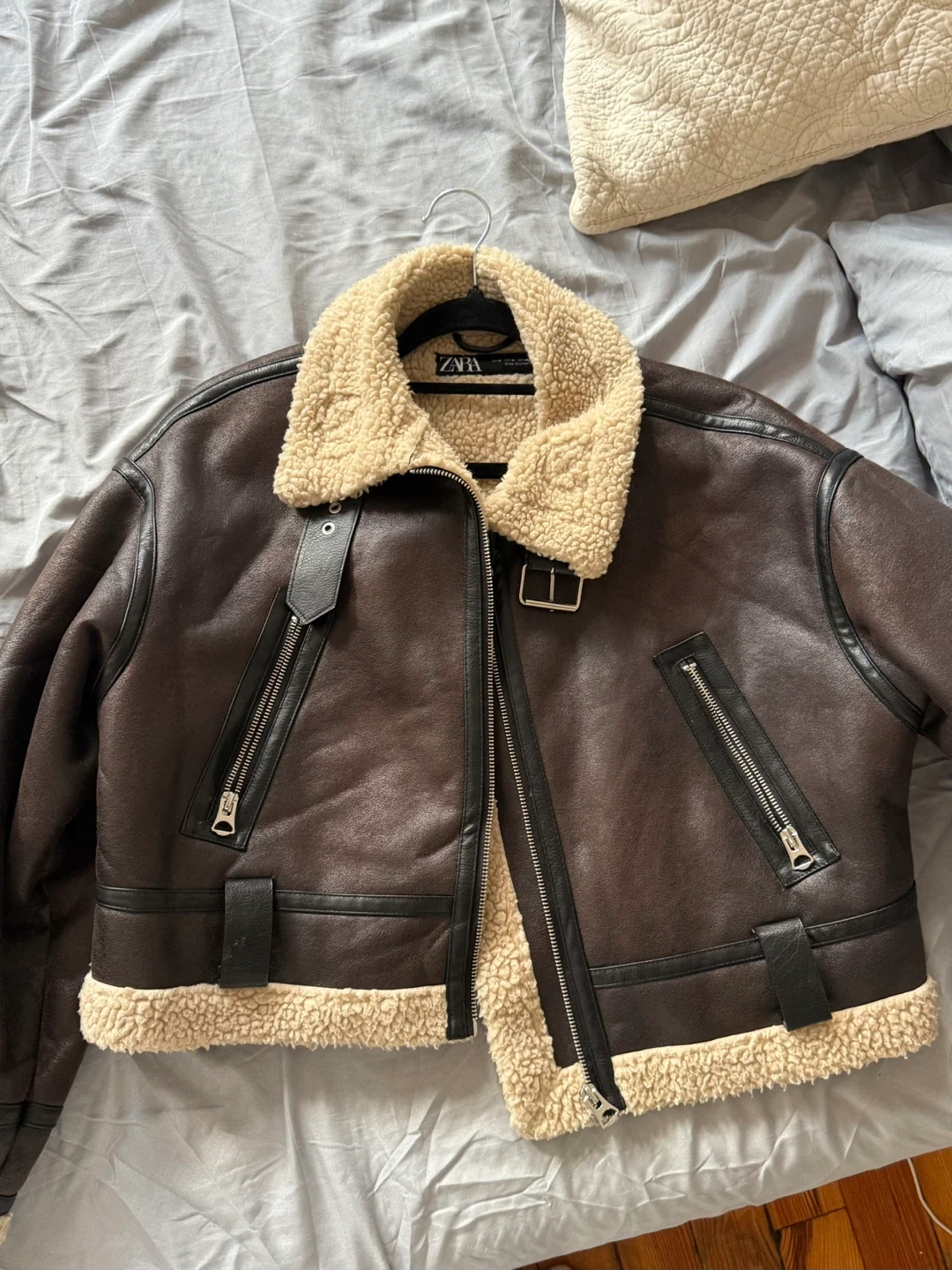 15Selling a Zara aviator jacket in a stylish brown faux leather! It features a cozy, cream-colored faux shearling lining and trim. This jacket is a size M and is in great condition. Perfect for adding a touch of edgy warmth to your wardrobe!