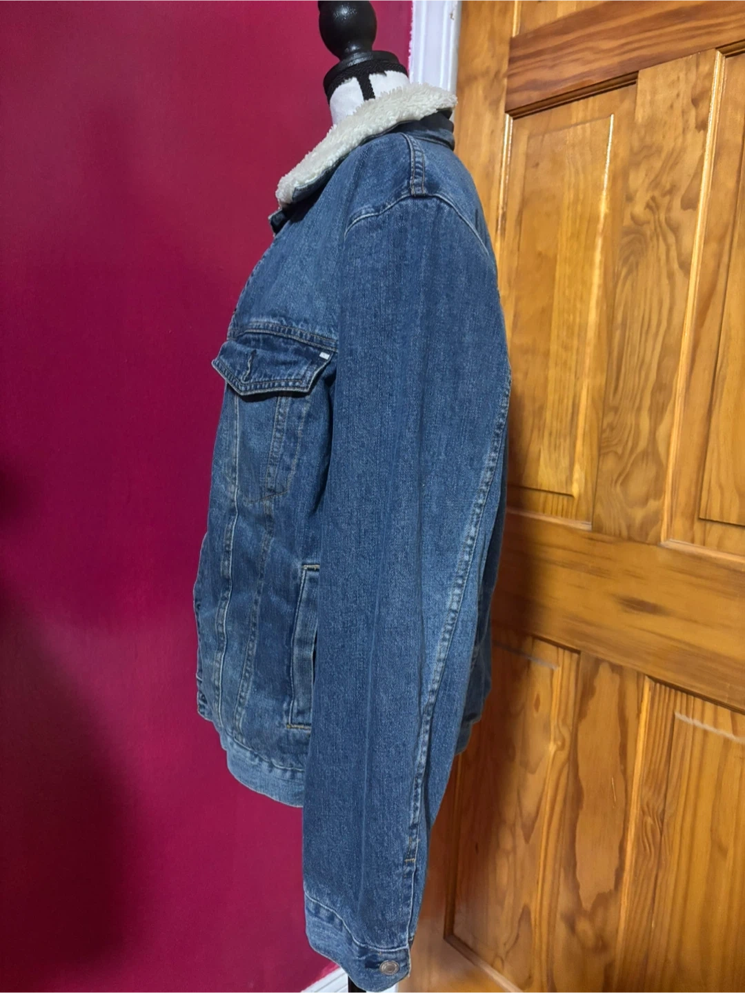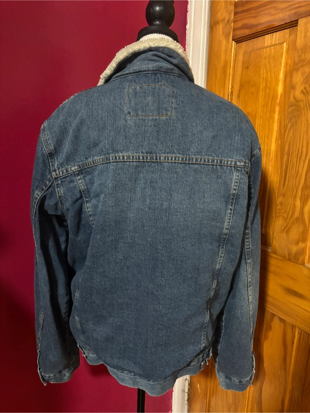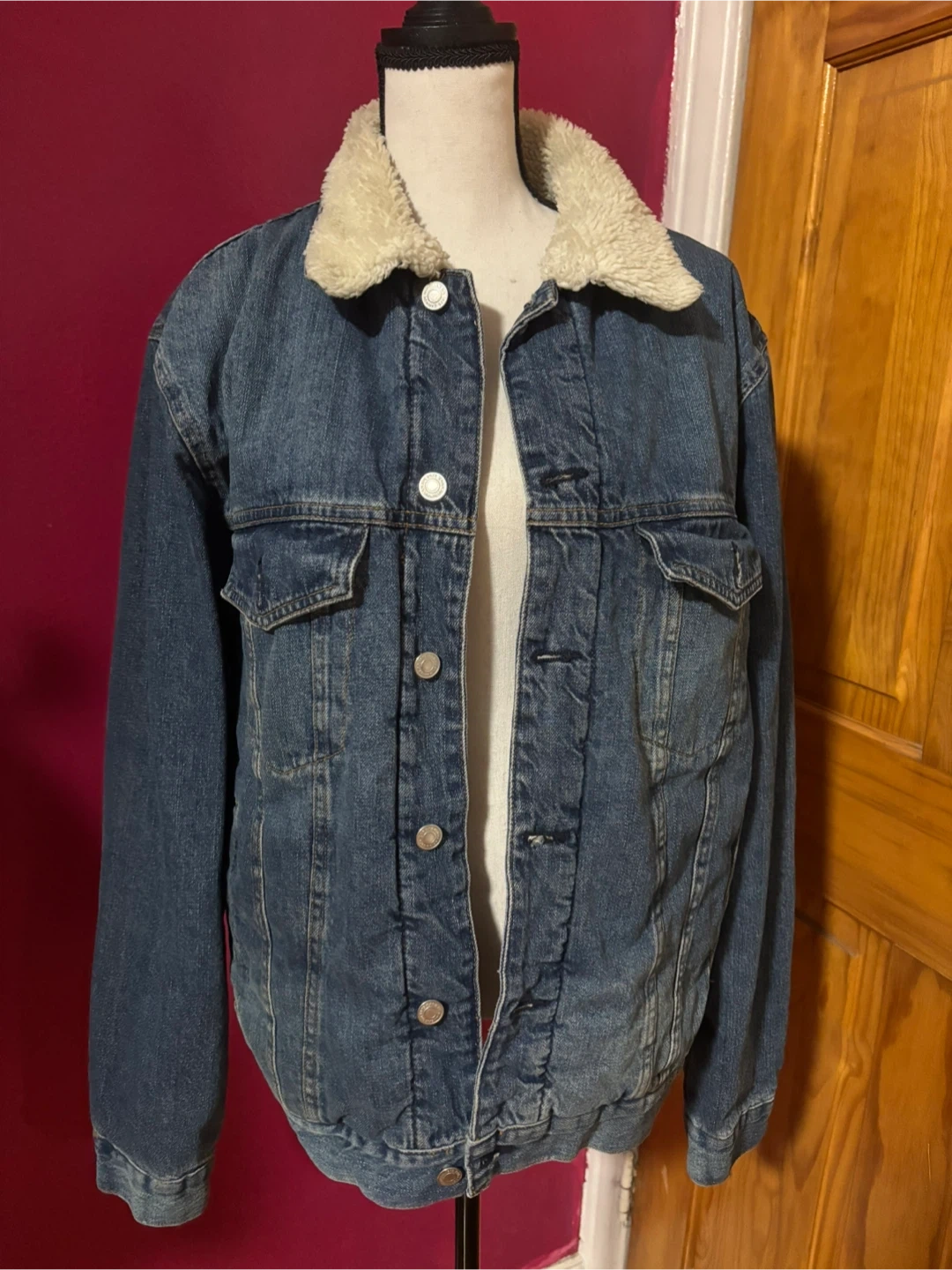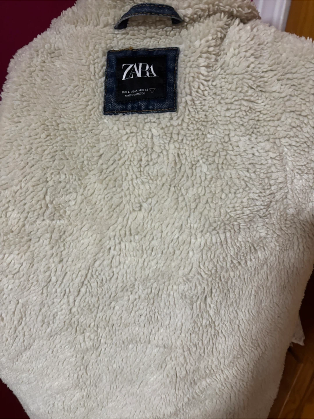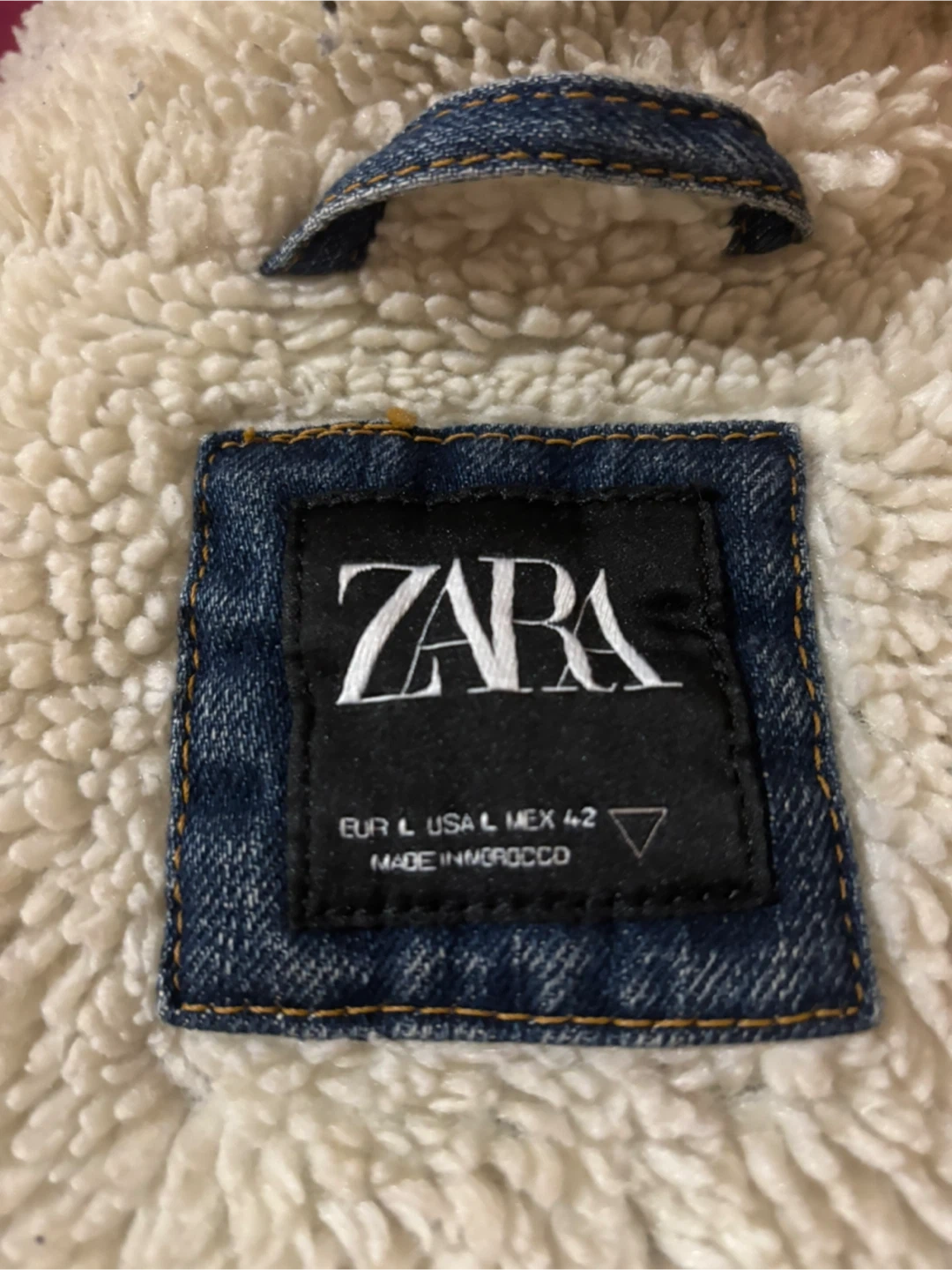 Selling a Zara denim jacket in size L. It's in great condition and features a cozy sherpa lining. Perfect for adding a stylish layer to your outfits!