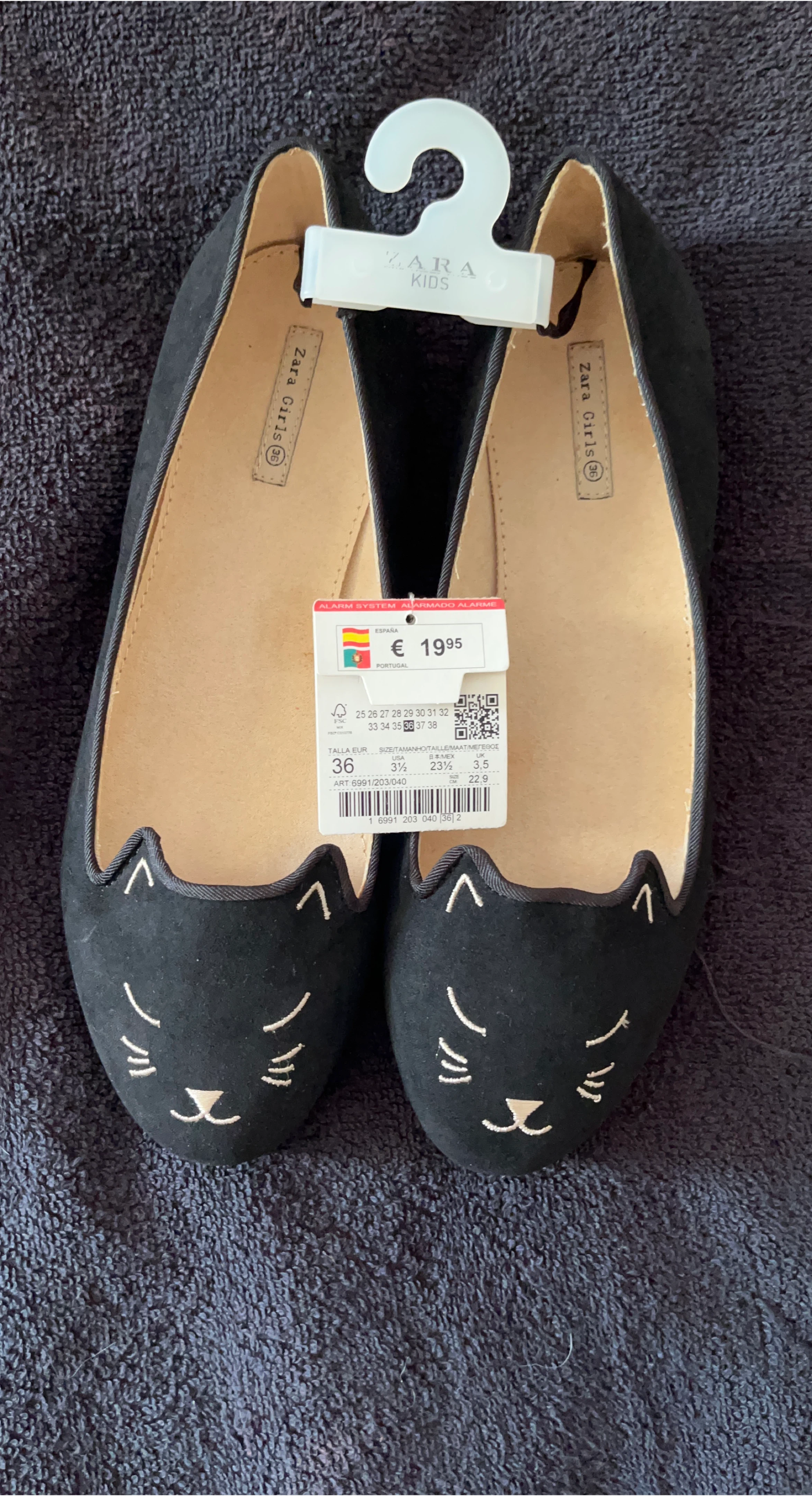 60These adorable Zara Girls ballet flats feature a cute cat design on the front. They are black and in size 3 1/2. The original price tag shows €19.95. Perfect for your little one.