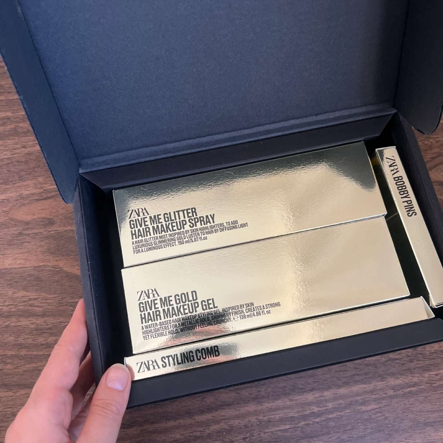 Selling a brand new Zara Give Me Gold Hair Makeup Set! This set includes: - Zara Give Me Gold Hair Makeup Gel - Zara Give Me Glitter Hair Makeup Spray - Zara Styling Comb - Zara Bobby Pins Everything comes in the original box