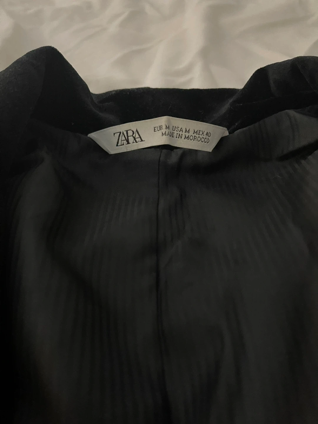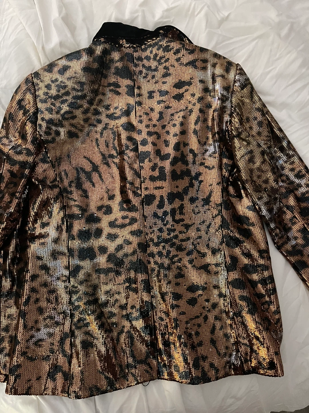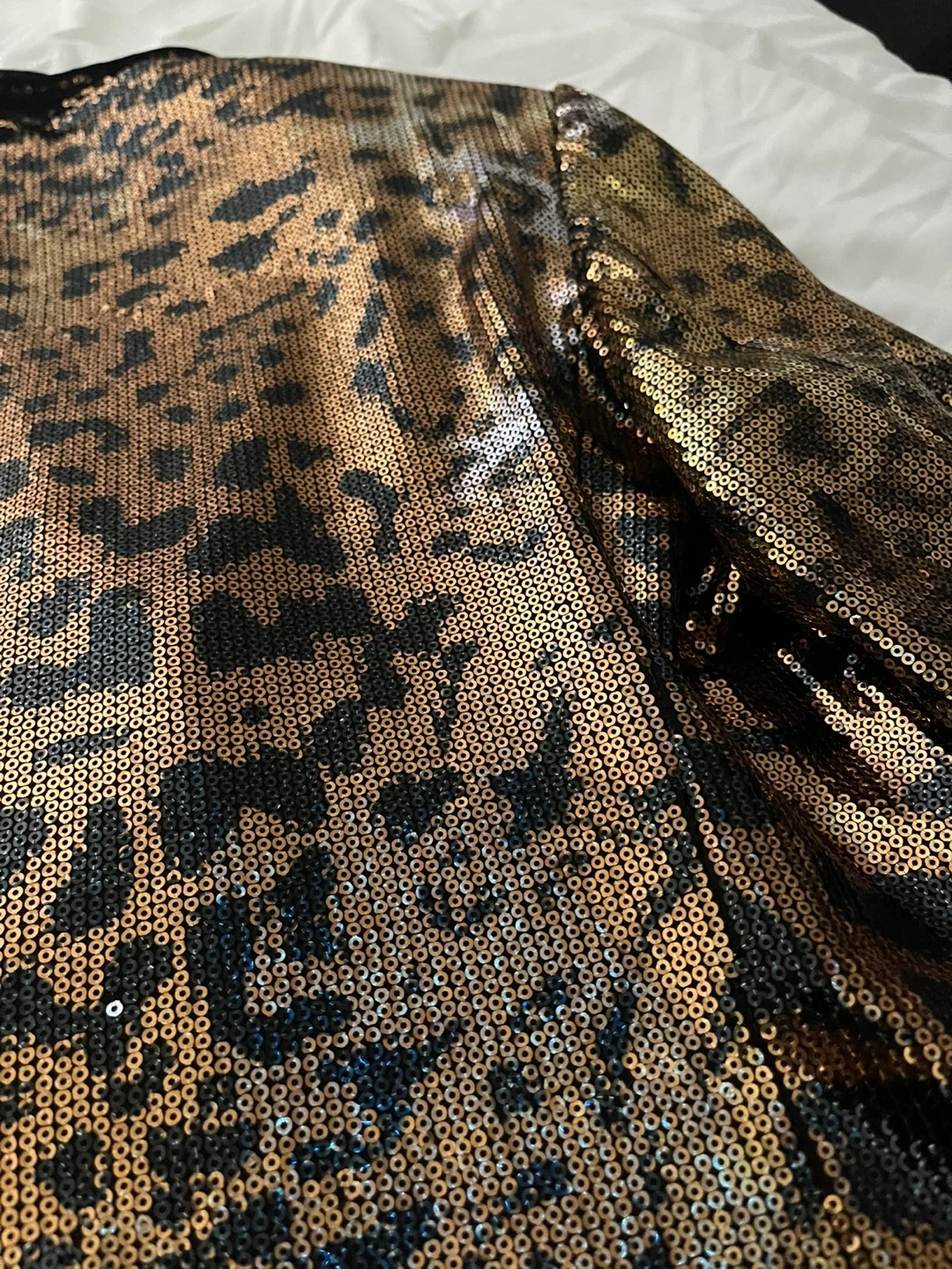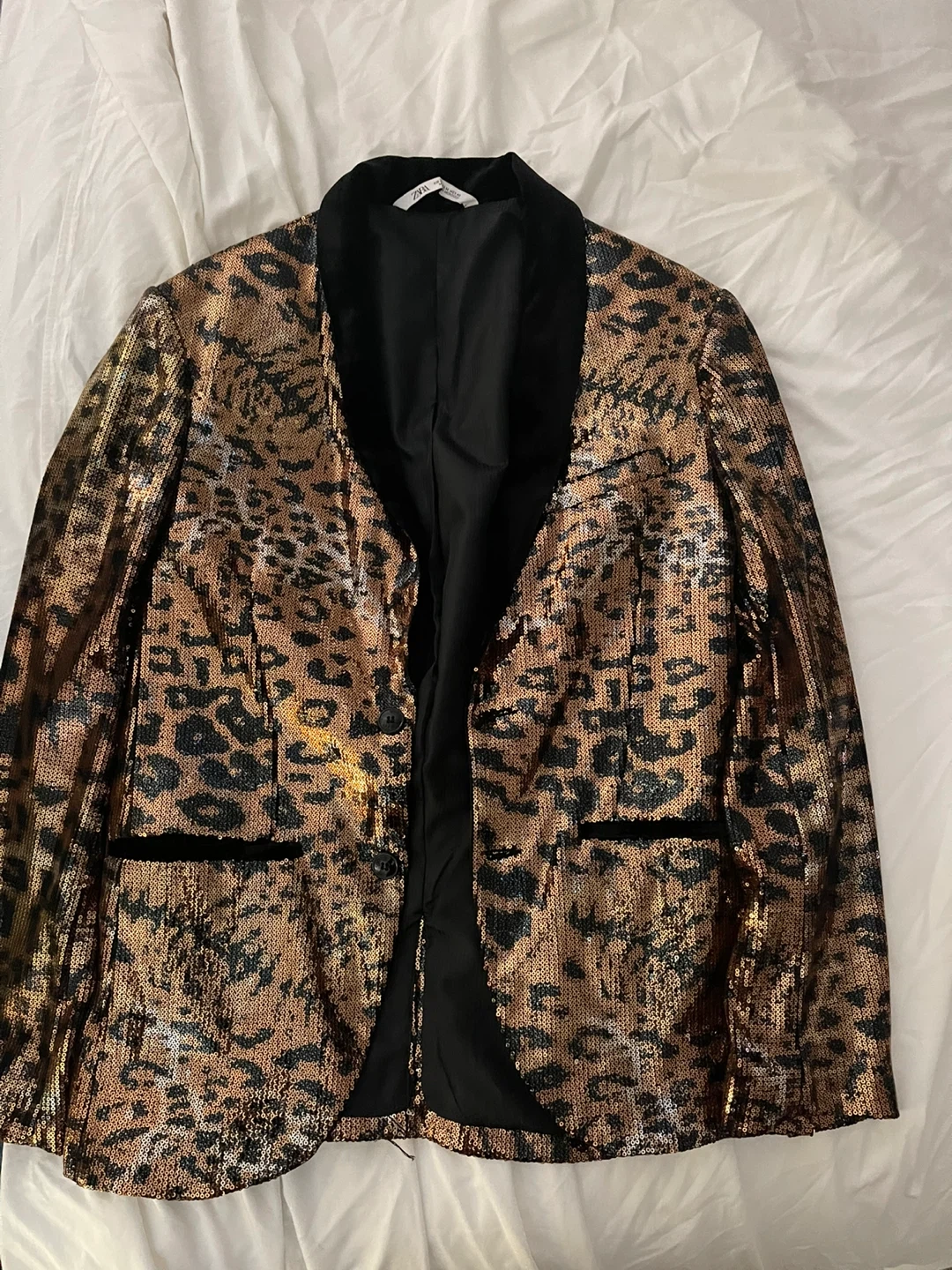 Selling a Zara blazer with a bold sequin animal print! The blazer is a size M and features a black velvet collar and lining. The outer material has a shiny, eye-catching sequin design in shades of brown and black.