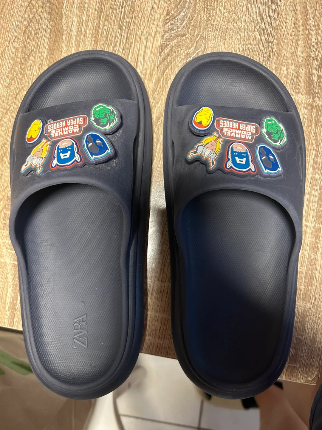 These Zara slides are super comfy and stylish! They feature fun Marvel Super Hero charms that add a unique touch. Perfect for casual wear, these sandals are in great condition and ready for a new home