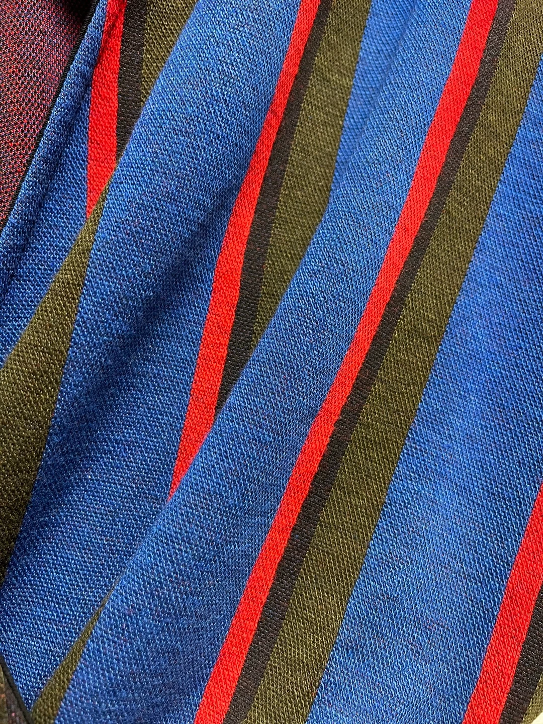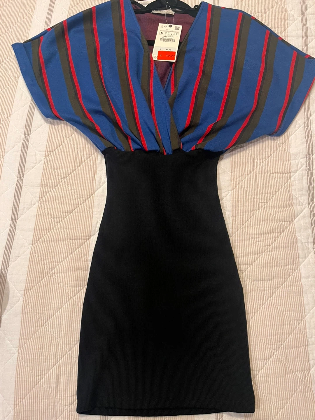 Zara dress with a striped top and black bottom. The top features blue, red, and olive green stripes. It's a size small.