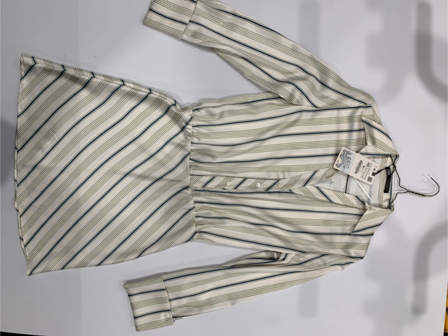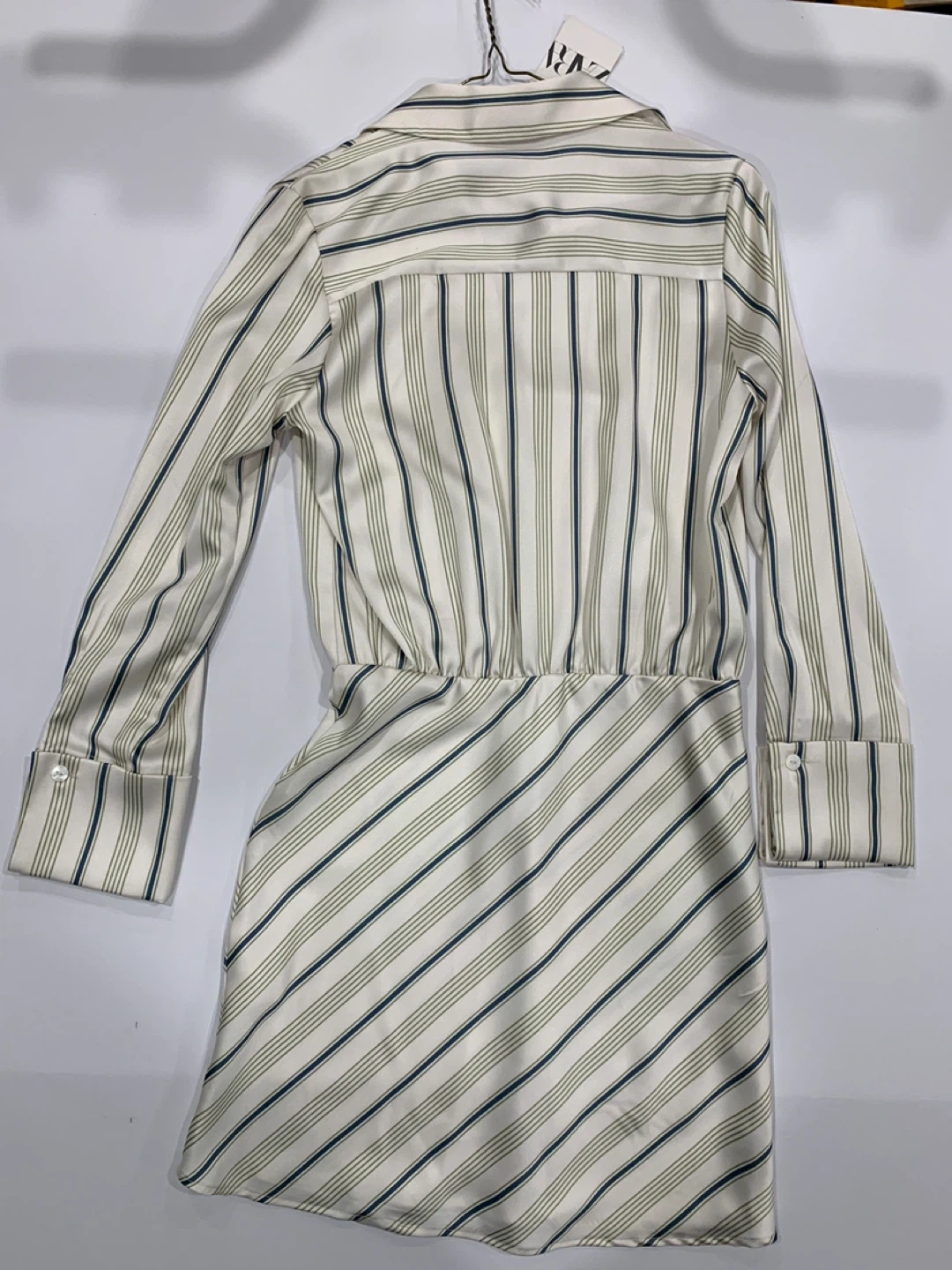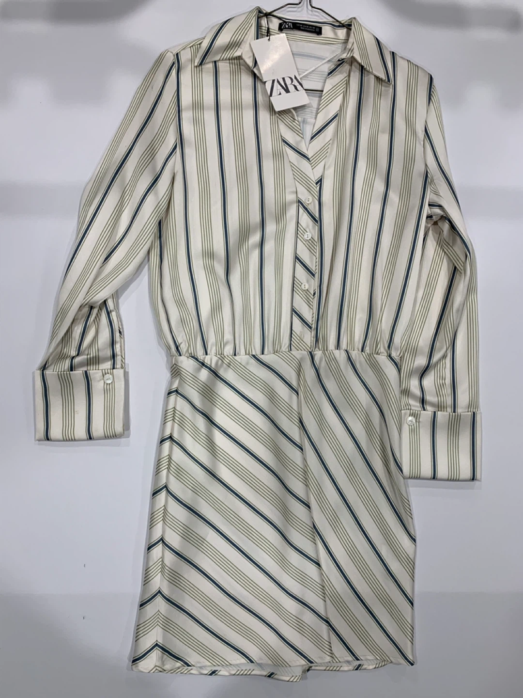 MAKE AN OFFER This is a Zara mini dress with a striped pattern. It features long sleeves and a button-up front. The dress has a fitted waist and a flared skirt, making it a stylish and comfortable choice for various occasions