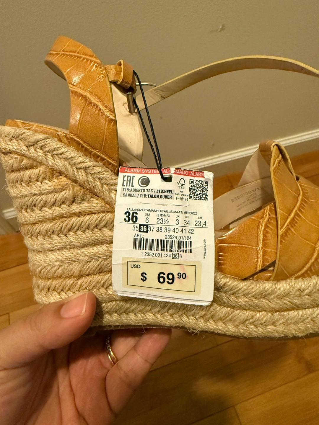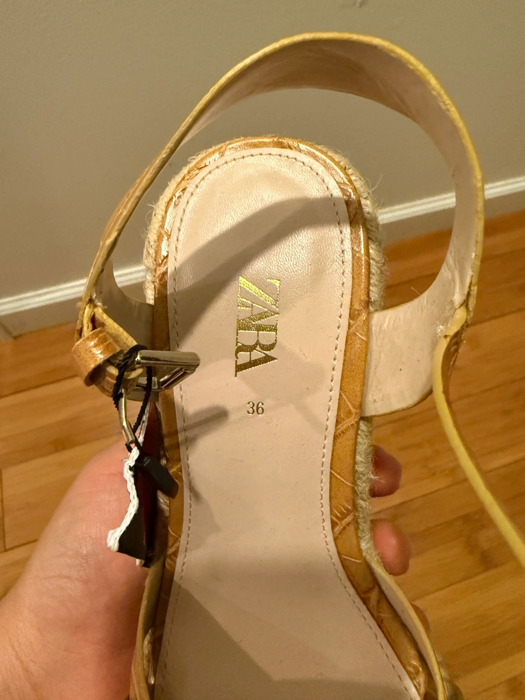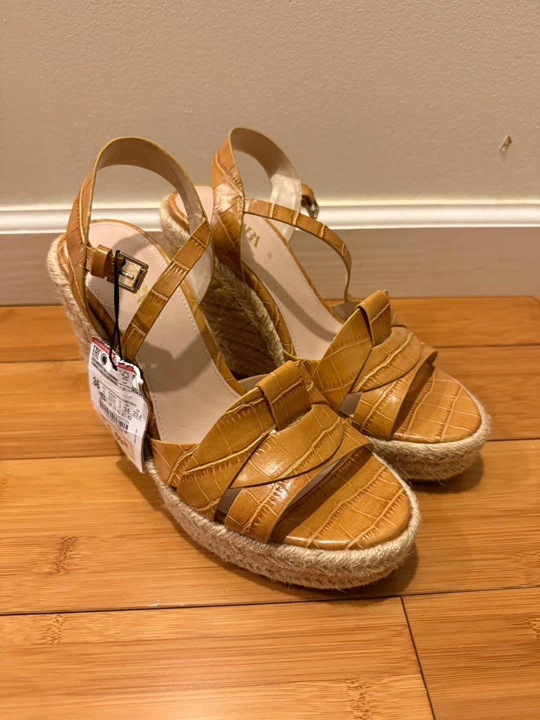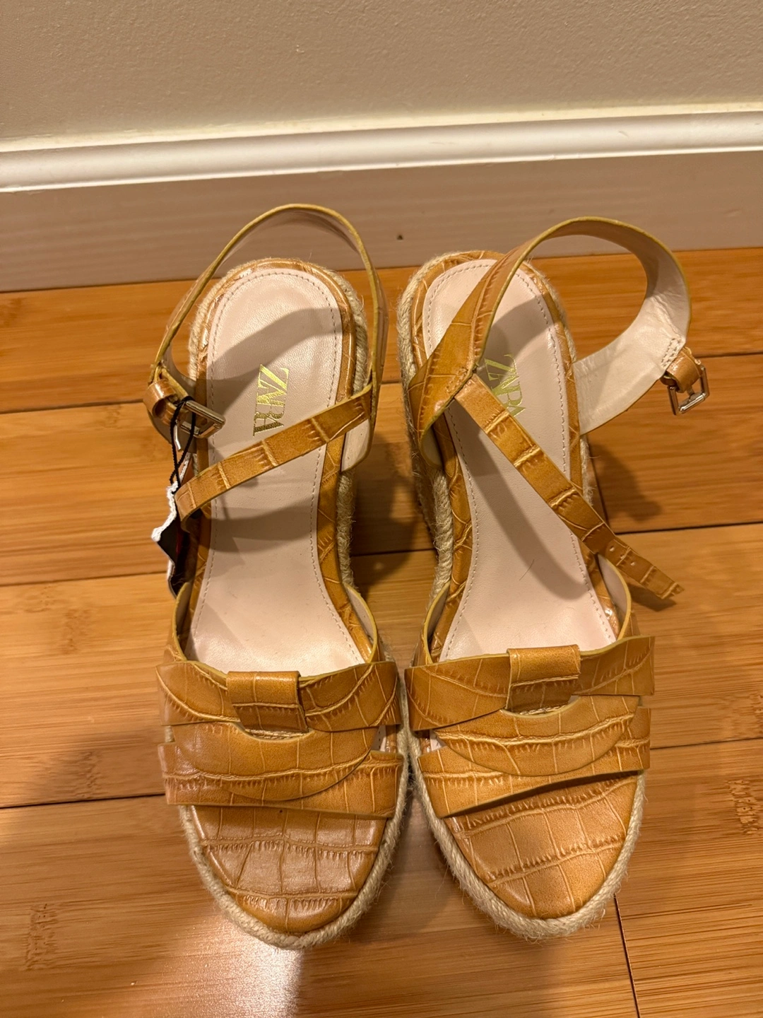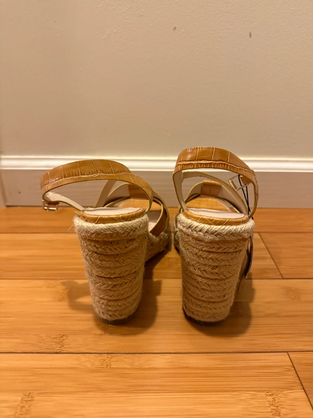 Light brown heels with a jute sole. Features criss-cross straps. Ankle strap with a buckle closure. You can wear these with your favorite outfit and take a relaxing walk in the park. New with Tag!