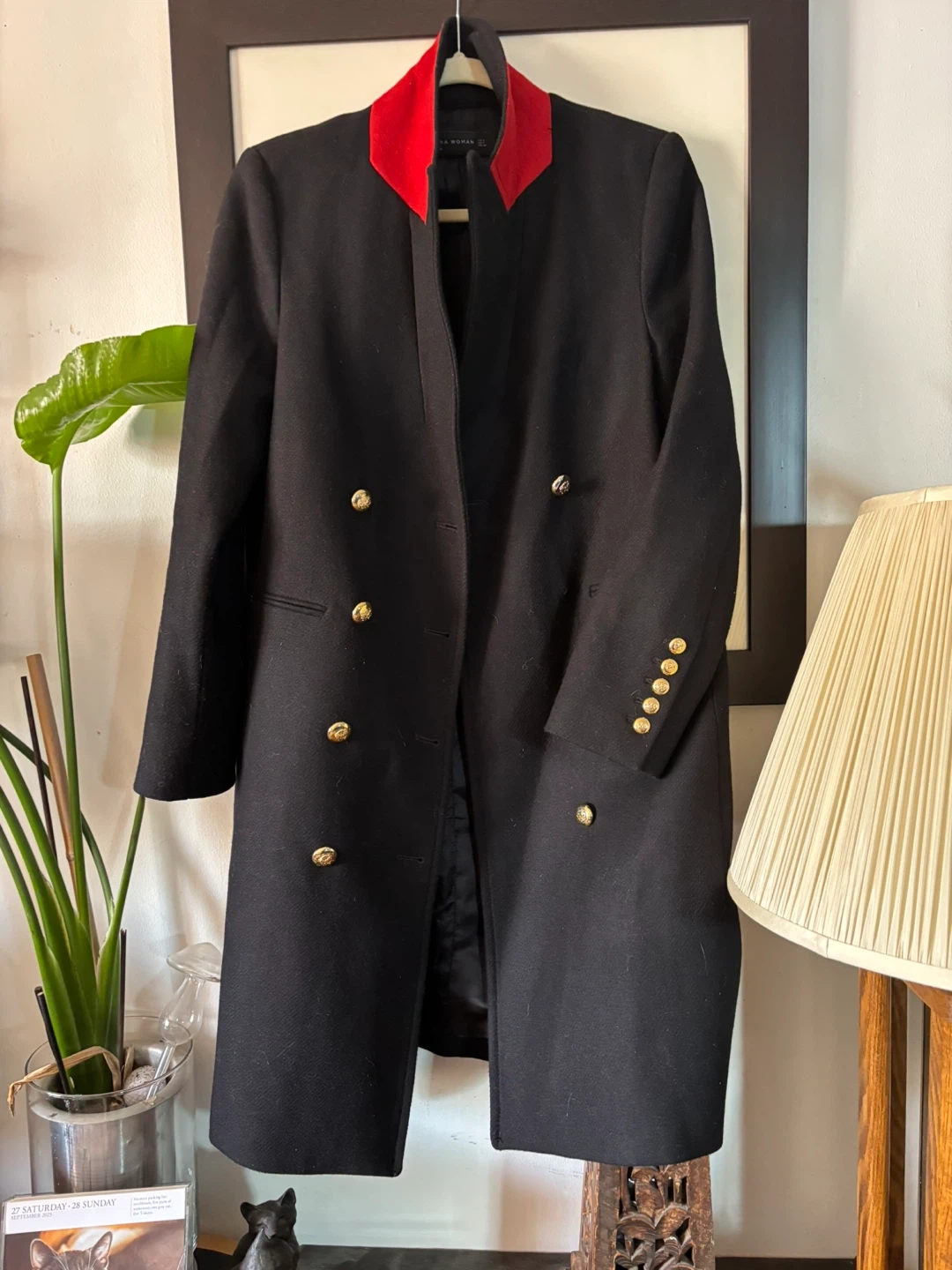 20Selling a Zara Woman black coat that features a stylish red collar. It's a double-breasted design with gold-tone buttons. Great for adding a touch of elegance to your wardrobe! Missing one button