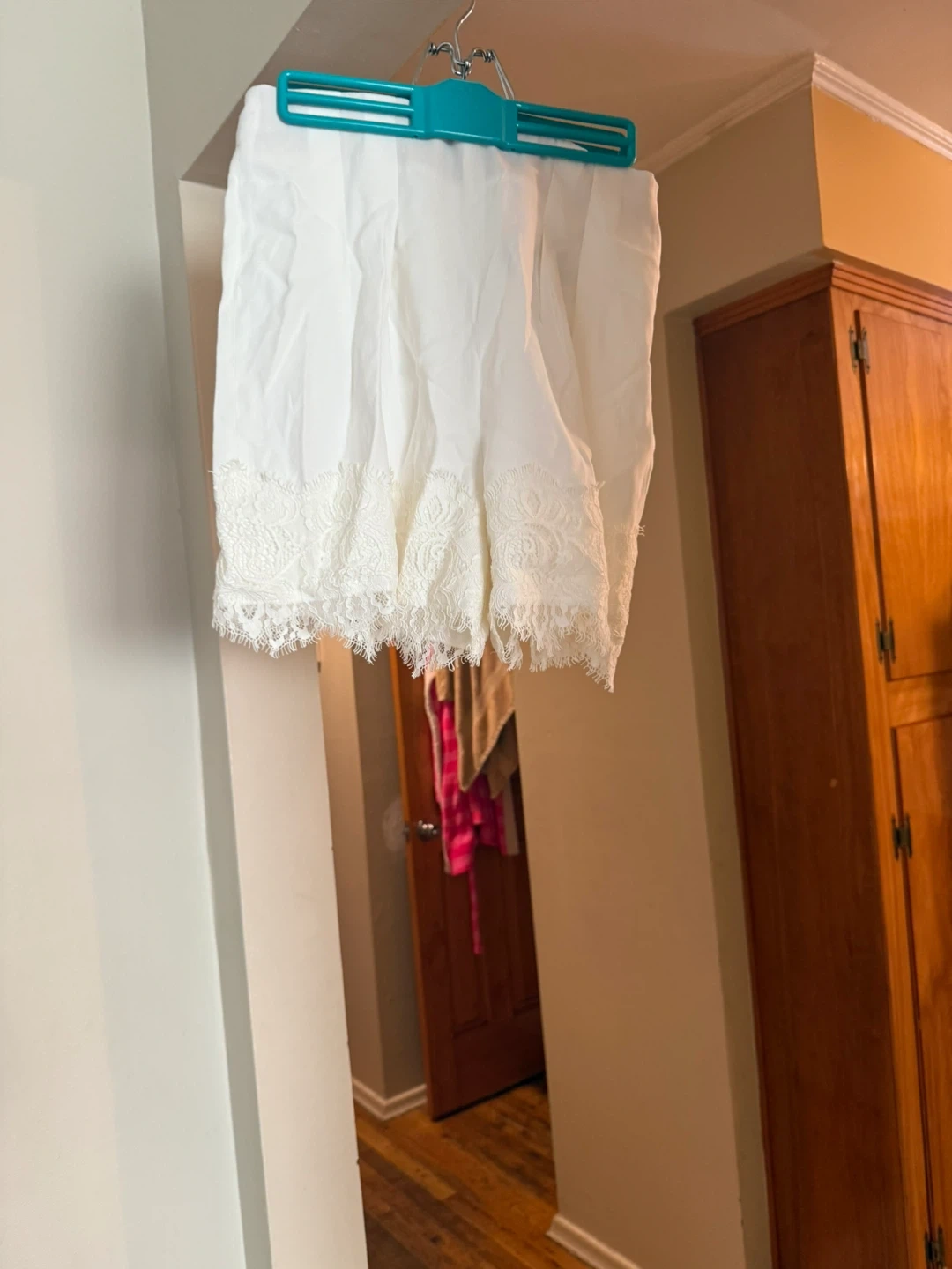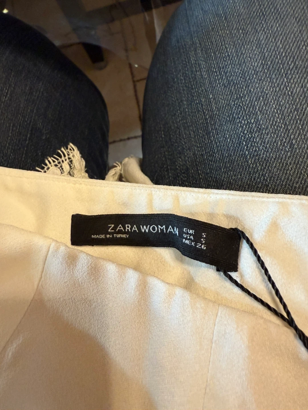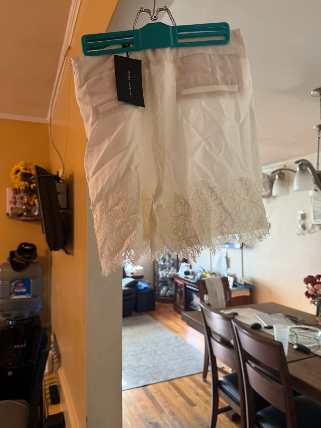Here are some lovely white Zara Woman shorts! They feature a delicate lace trim at the bottom, adding a touch of elegance to a casual style. These shorts are perfect for warm weather and can be dressed up or down. They are in great condition and ready for a new home