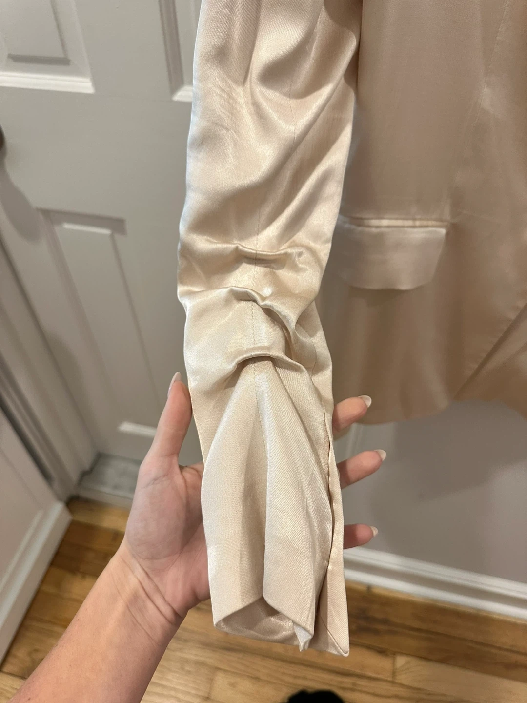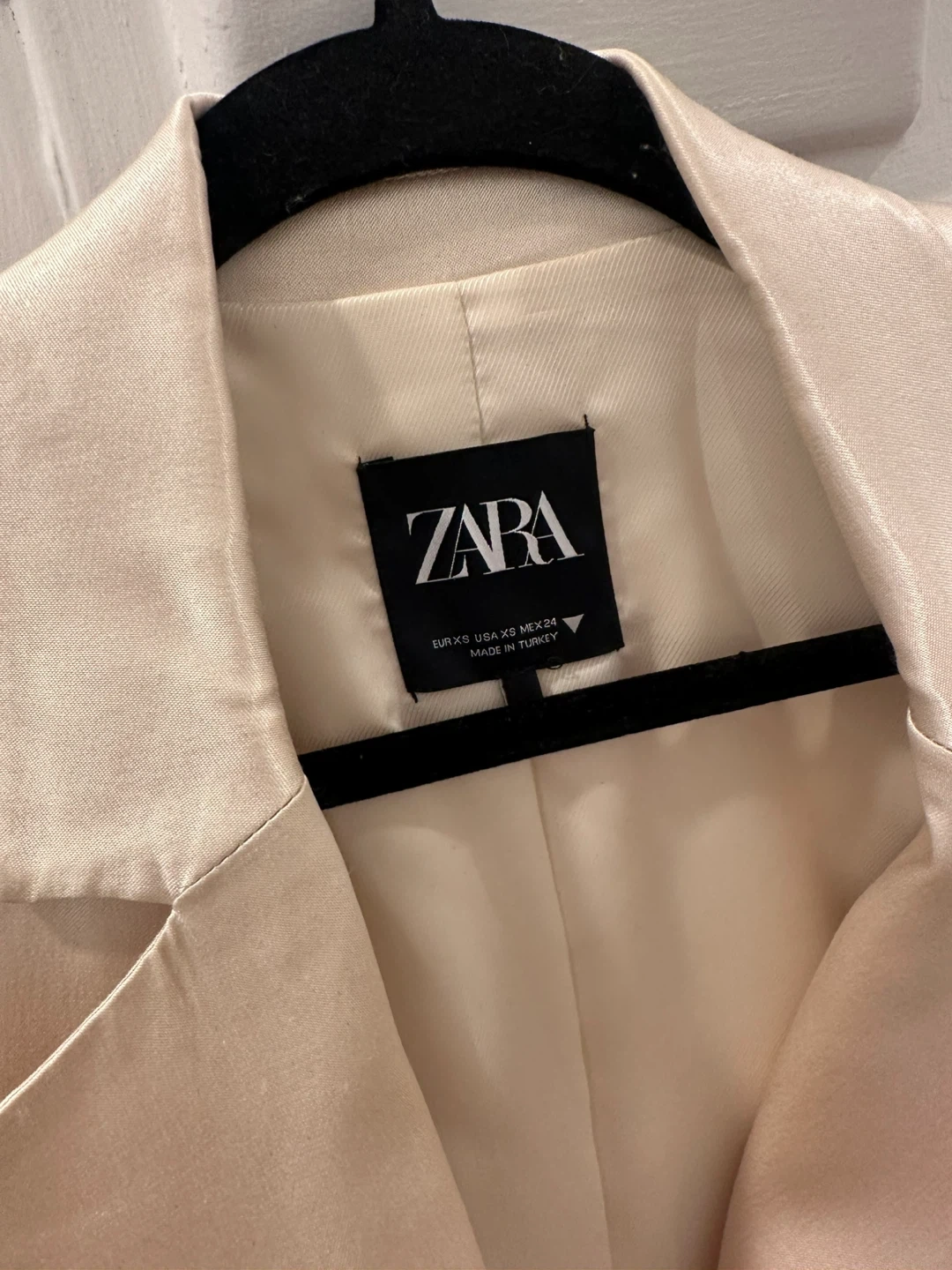 73Selling a Zara silk-satin blazer in size XS. It's a beautiful beige color and in great condition! Only worn once!