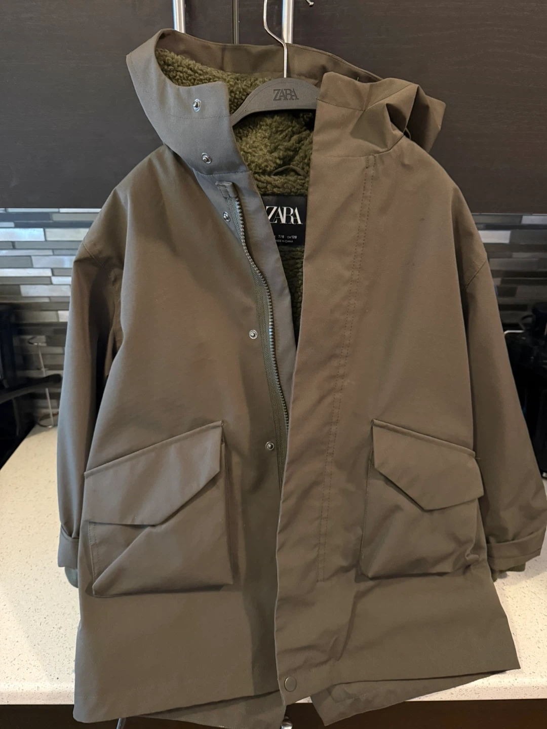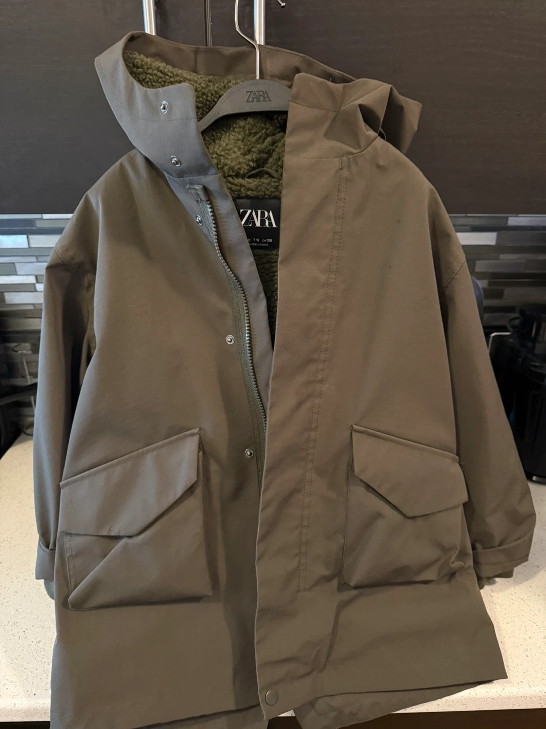 10🚨Must Pick Up In Staten Island* Size: 7/8 Kids Color: Olive Green Selling a Zara olive green hooded parka in size 7/8. It's in great condition and perfect for keeping warm!