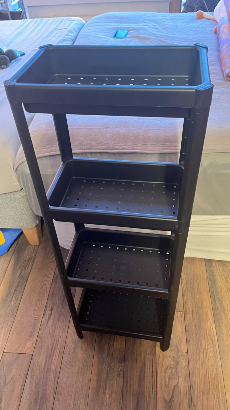 This black 4-tier utility rack offers versatile storage. It's made of durable plastic and features perforated shelves for drainage. This rack is great for organizing items in a bathroom, kitchen, or craft room!