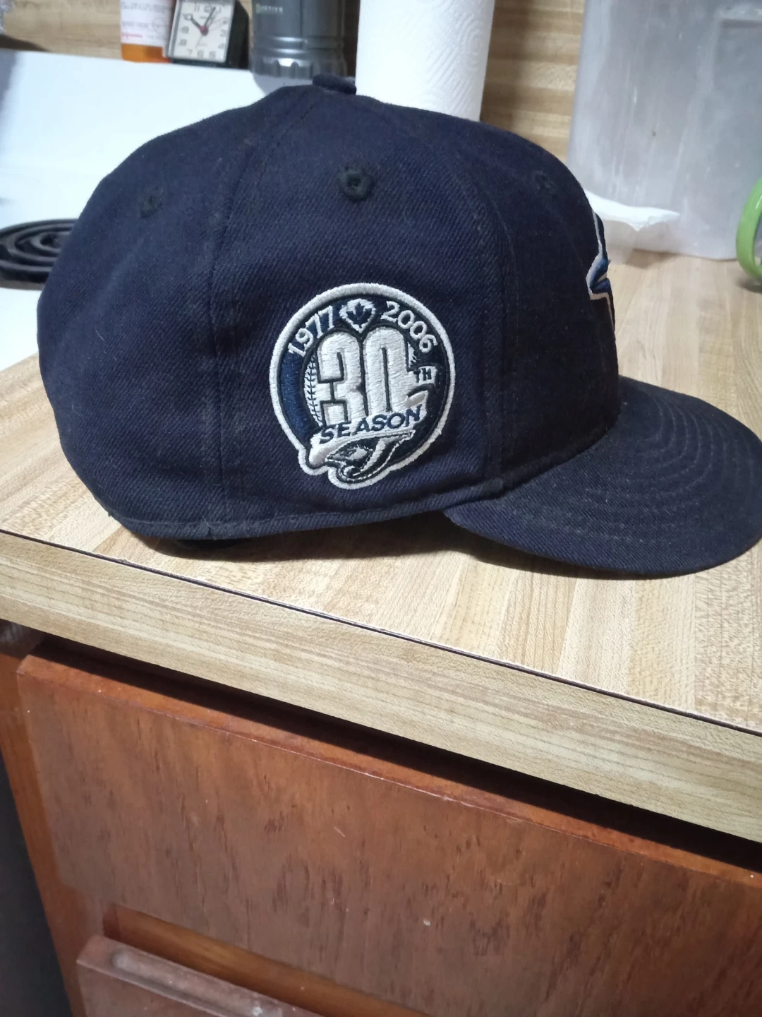 This is a New Era 59FIFTY fitted baseball cap celebrating the Toronto Blue Jays' 30th season (1977-2006). It's a size 7 1/8 with the iconic Blue Jays logo on the front and the 30th-season patch on the side. The cap is navy blue with white and blue embroidery.