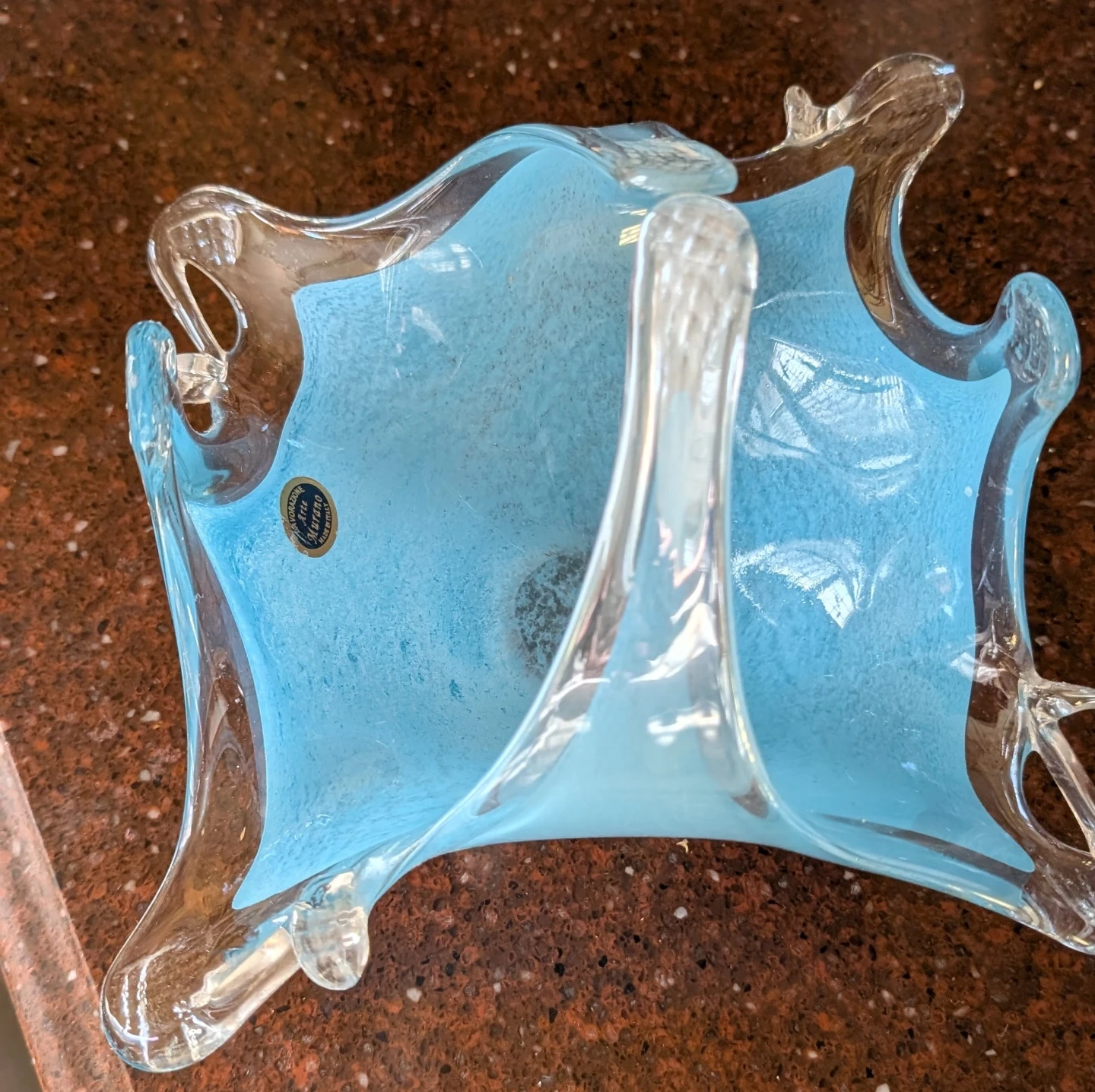 Beautiful art glass candy dish with a blue swirl design. It's made of glass and features a unique, sculptural shape with clear glass handles. Perfect for holding candies or as a decorative accent piece!
