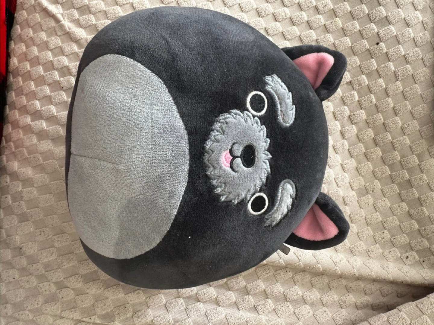 Here's a cute Squishmallow panda plush! It's in great condition and ready for a new home. The panda is black and gray with pink accents on the ears and nose. Perfect for cuddling or as a decorative pillow!