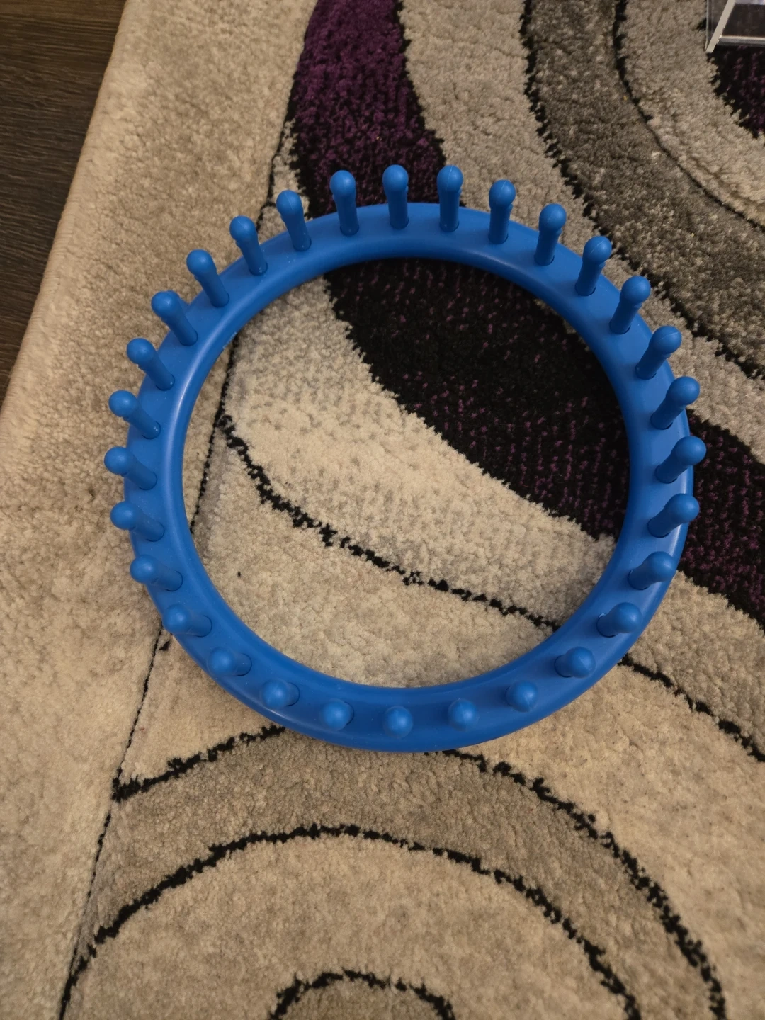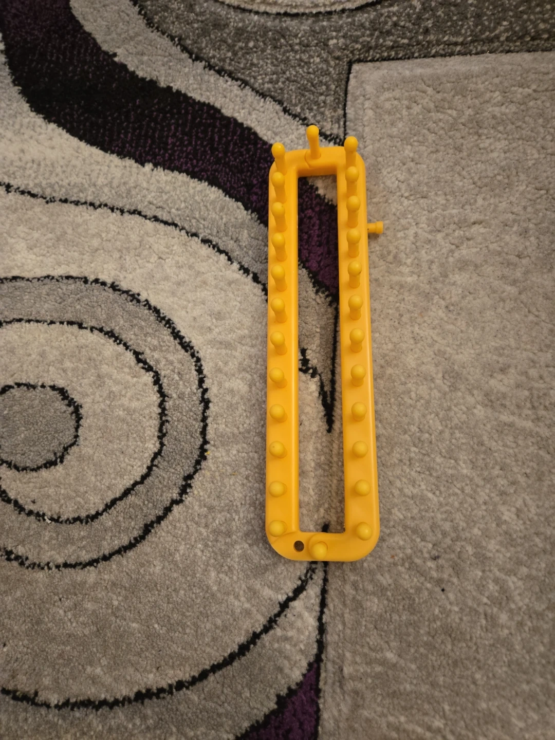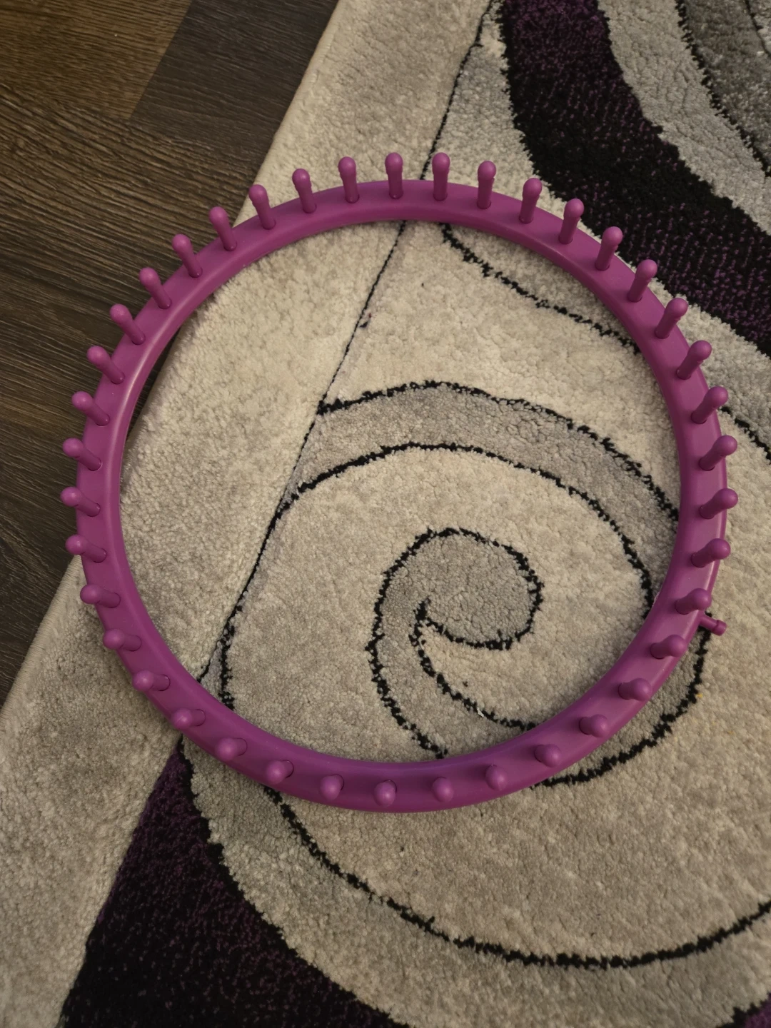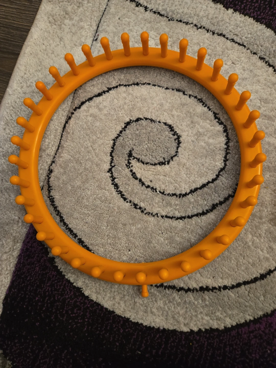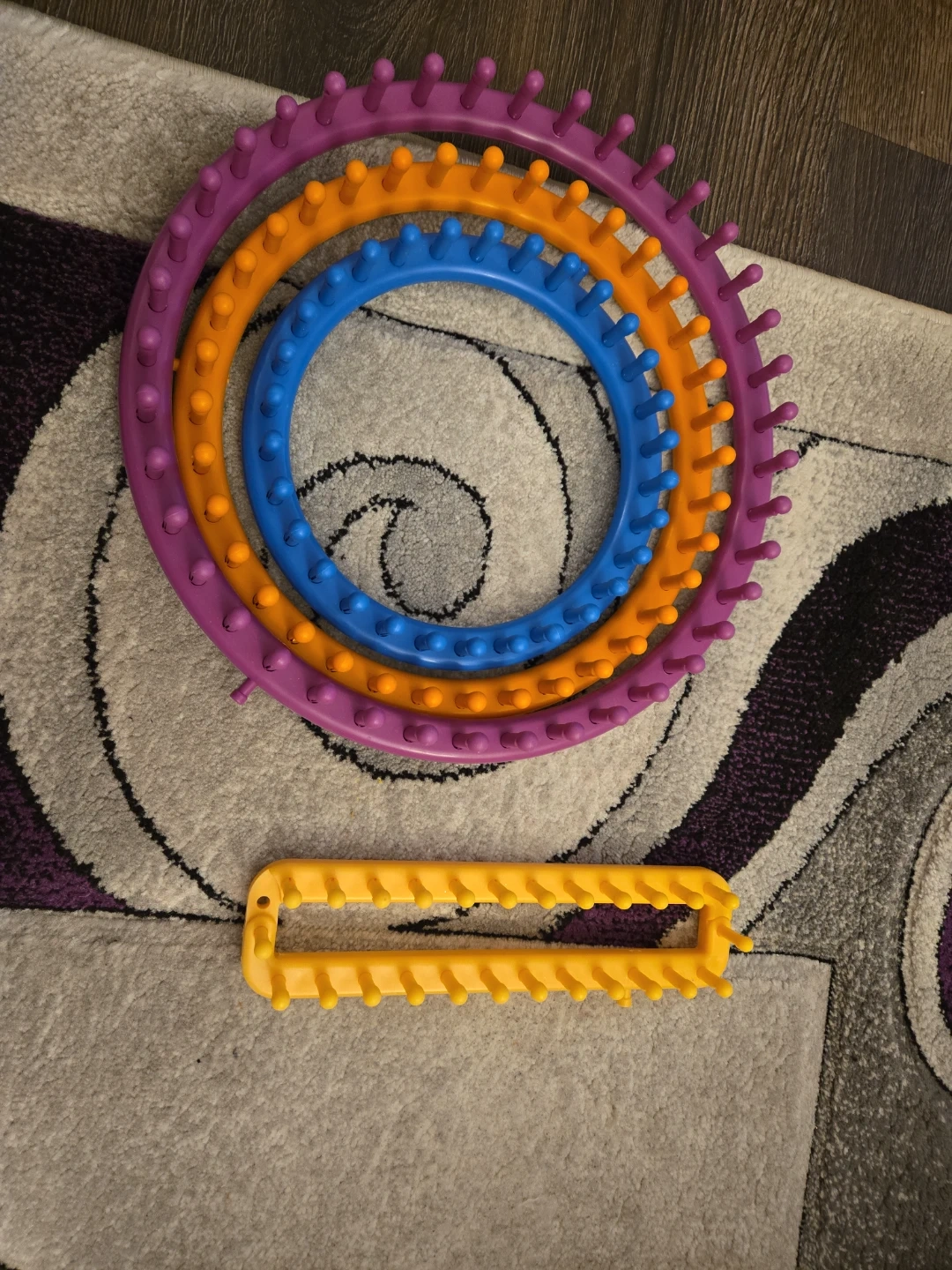 This set includes four round knitting looms in purple, orange, and a smaller blue one, plus one rectangular loom in yellow. They're made of plastic and great for crafting projects!