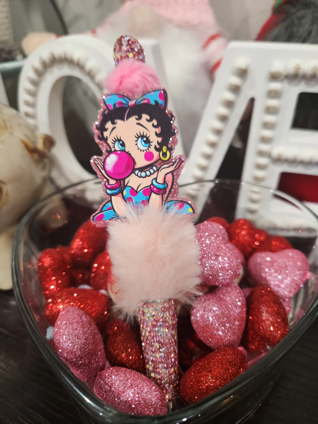 This is a super cute Betty Boop pen! It's covered in rhinestones and has a fluffy pink pompom on top. Perfect for adding a little sparkle to your day