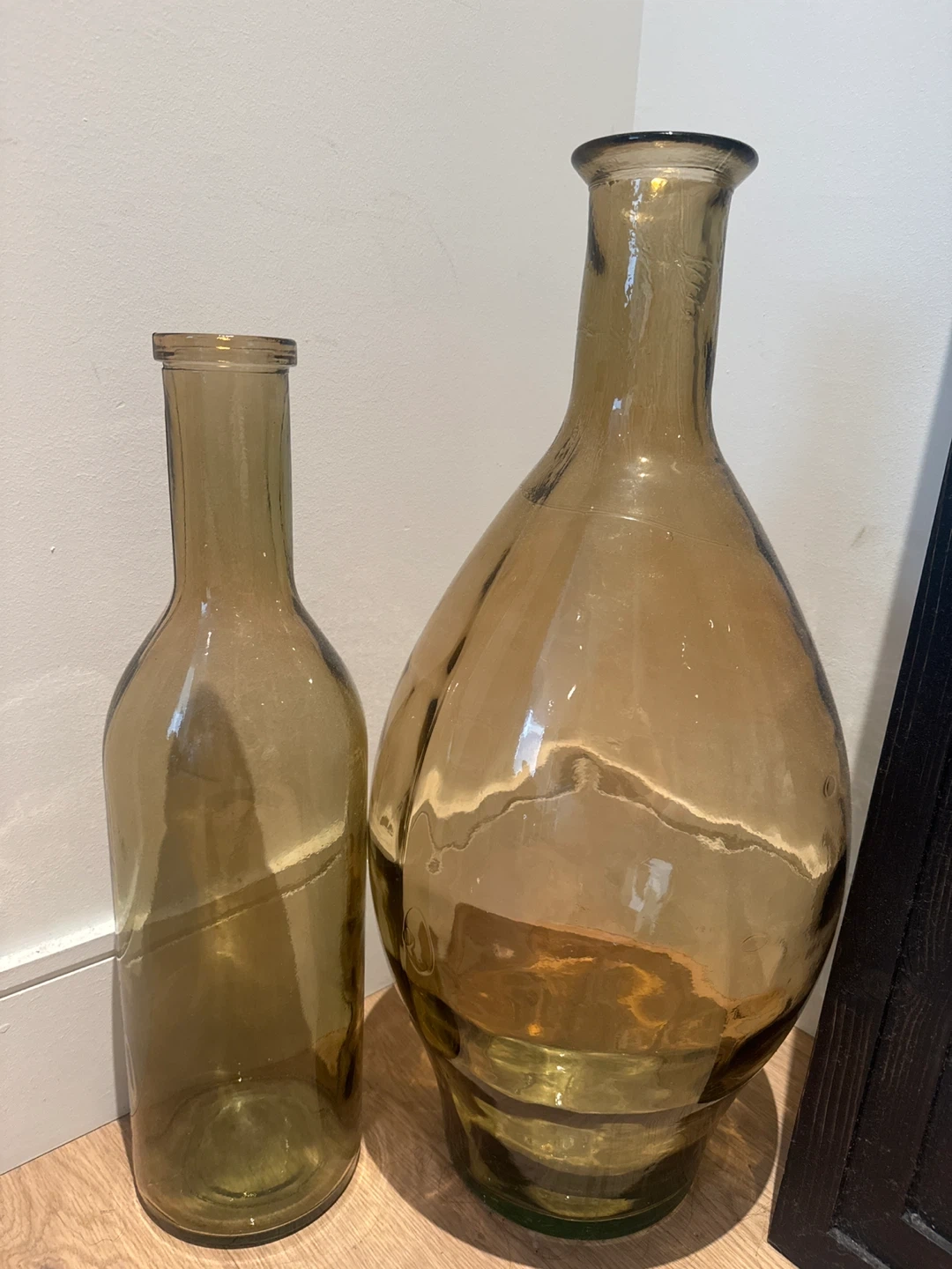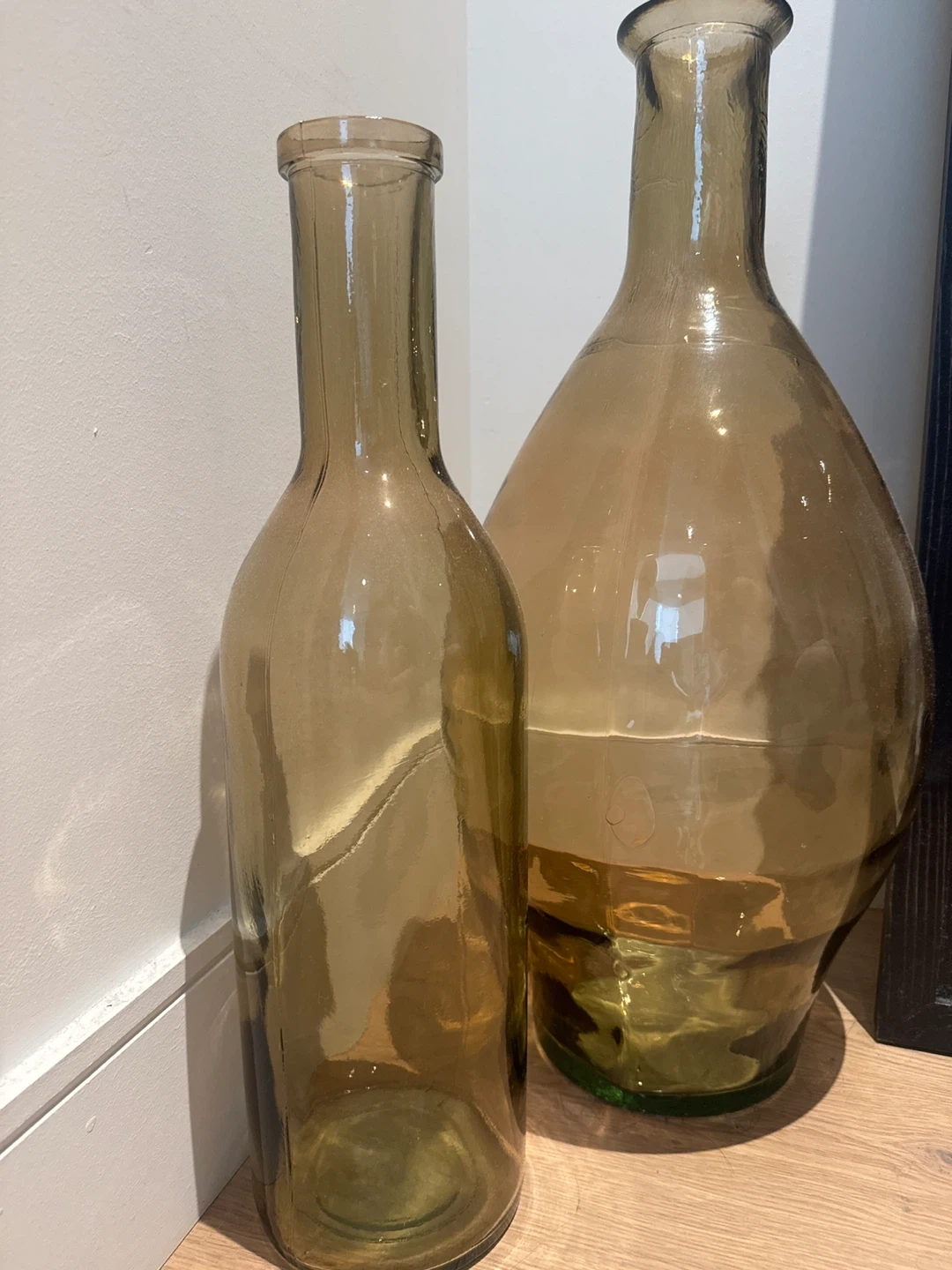 Two decorative amber glass bottles. One is tall and slender, the other is a rounder, bulbous shape. These could be used for vases or as standalone decor. Glass material.