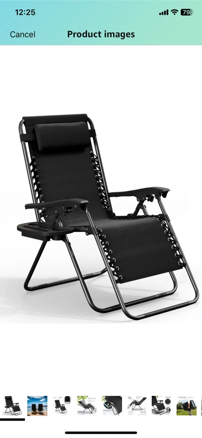 This zero gravity lounge chair is perfect for relaxing outdoors! It's black and looks to be in great condition. It only weighs 17.5 lbs and can hold up to 250 lbs. It measures 33.5-44 inches in height, 32.5-61 inches in length, and 25 inches in width