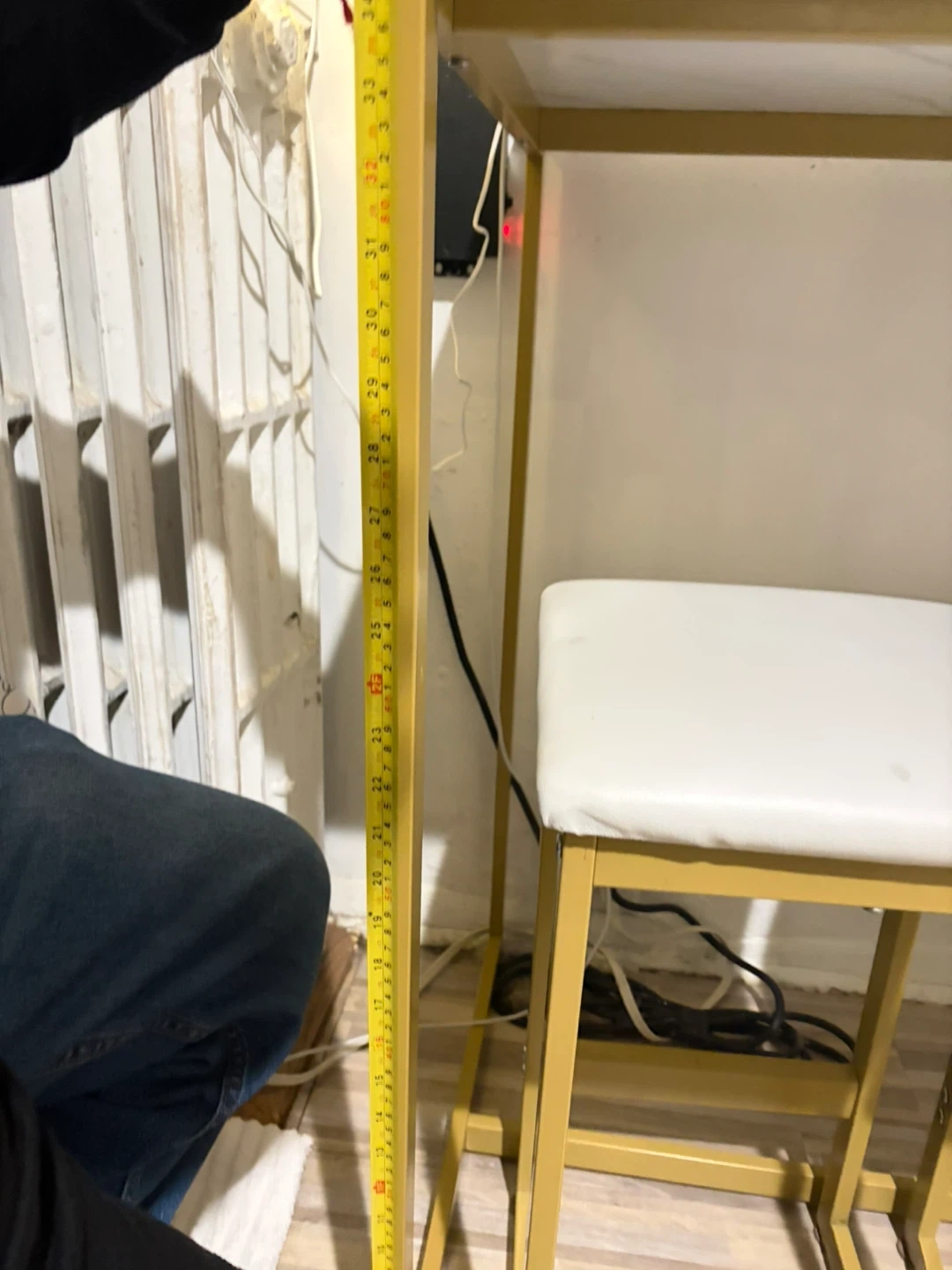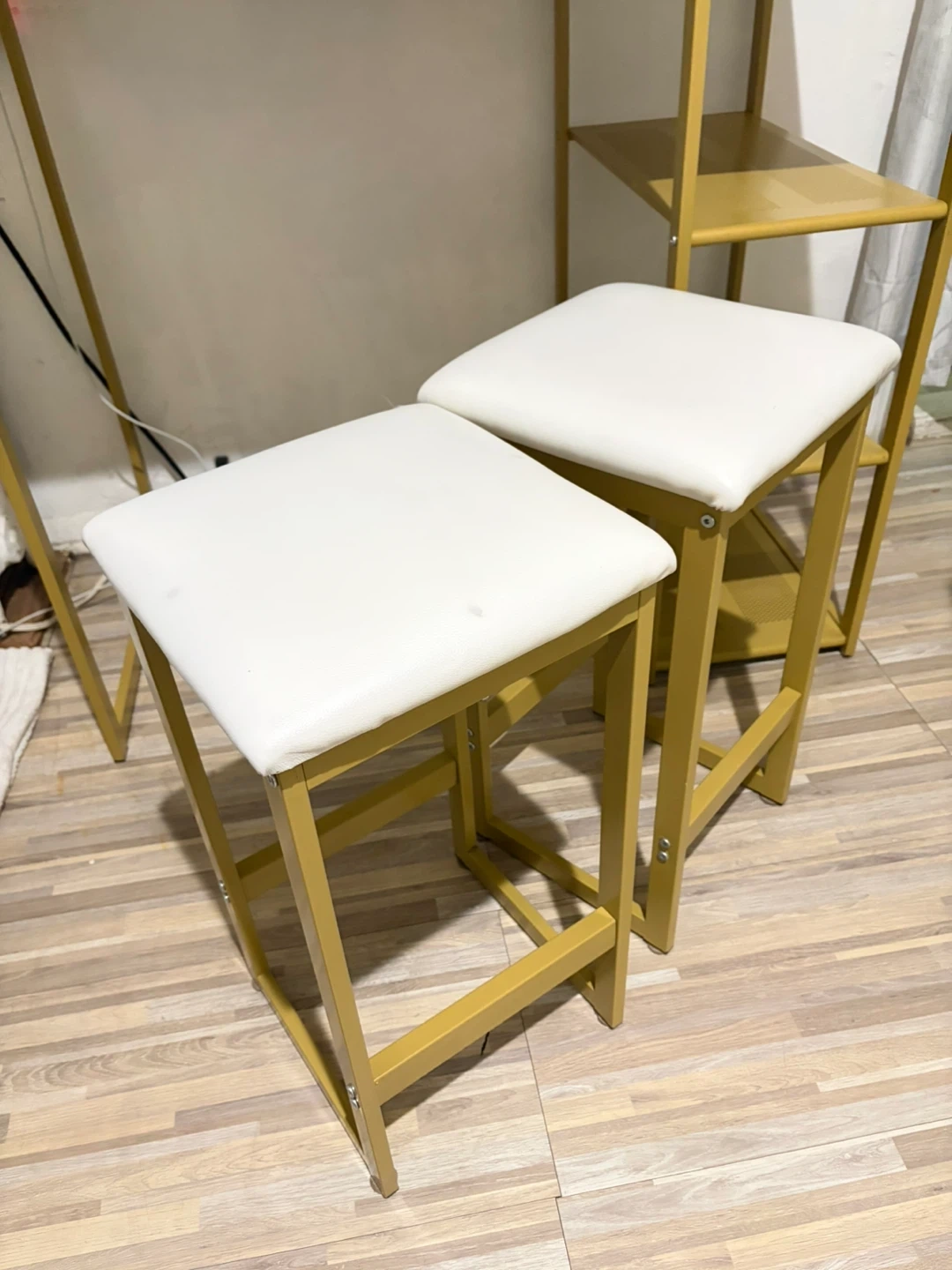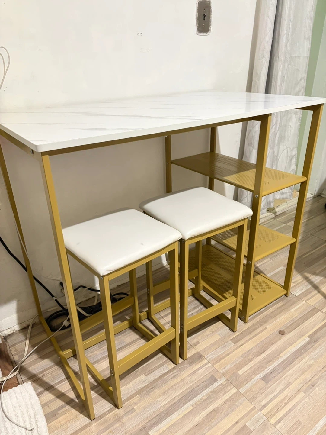 This bar table set features a white marble-look top and a gold metal frame. It includes two white upholstered stools that tuck neatly underneath. The table has built-in shelving on one side for extra storage. Dimensions: Table is approximately 42" long, 23 wide, and 36high. Stools are approximately 12" wide, 11" deep, and 24" high.