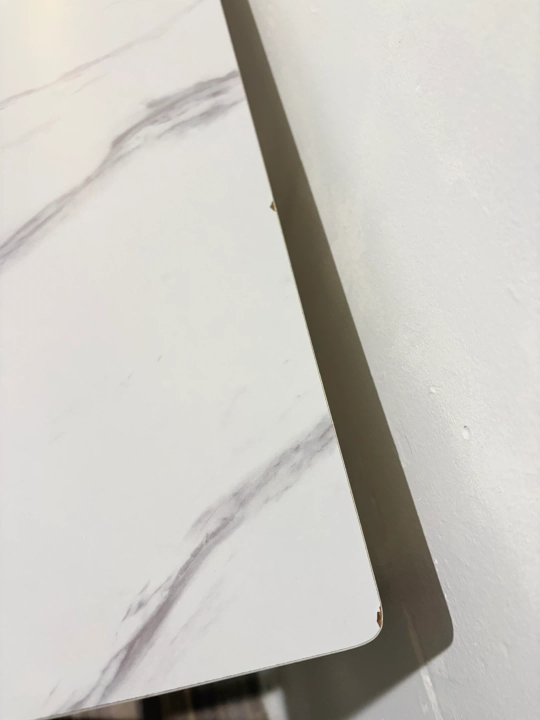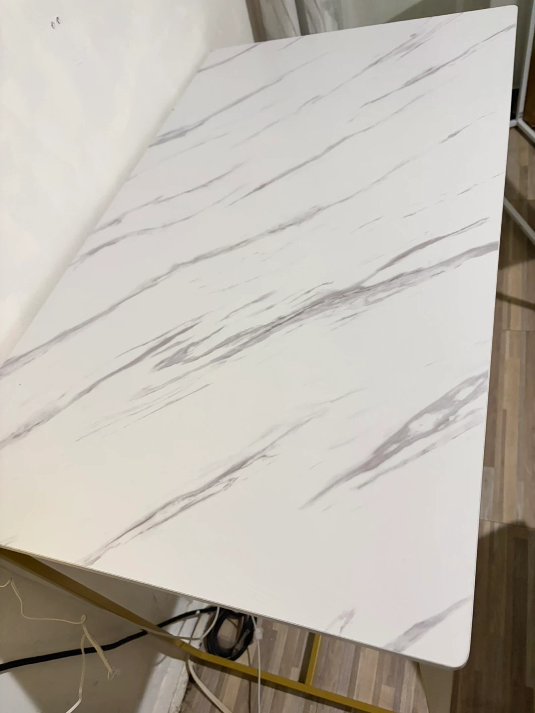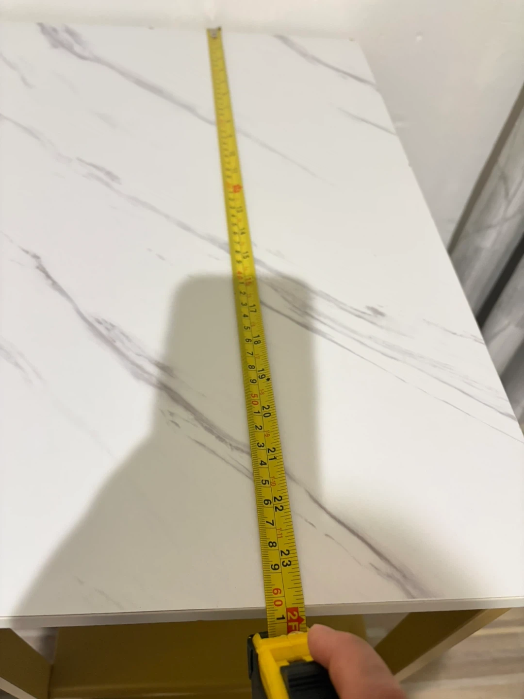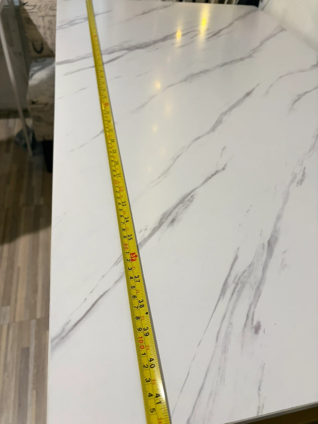 This bar table set features a white marble-look top and a gold metal frame. It includes two white upholstered stools that tuck neatly underneath. The table has built-in shelving on one side for extra storage. Dimensions: Table is approximately 42" long, 23 wide, and 36high. Stools are approximately 12" wide, 11" deep, and 24" high.