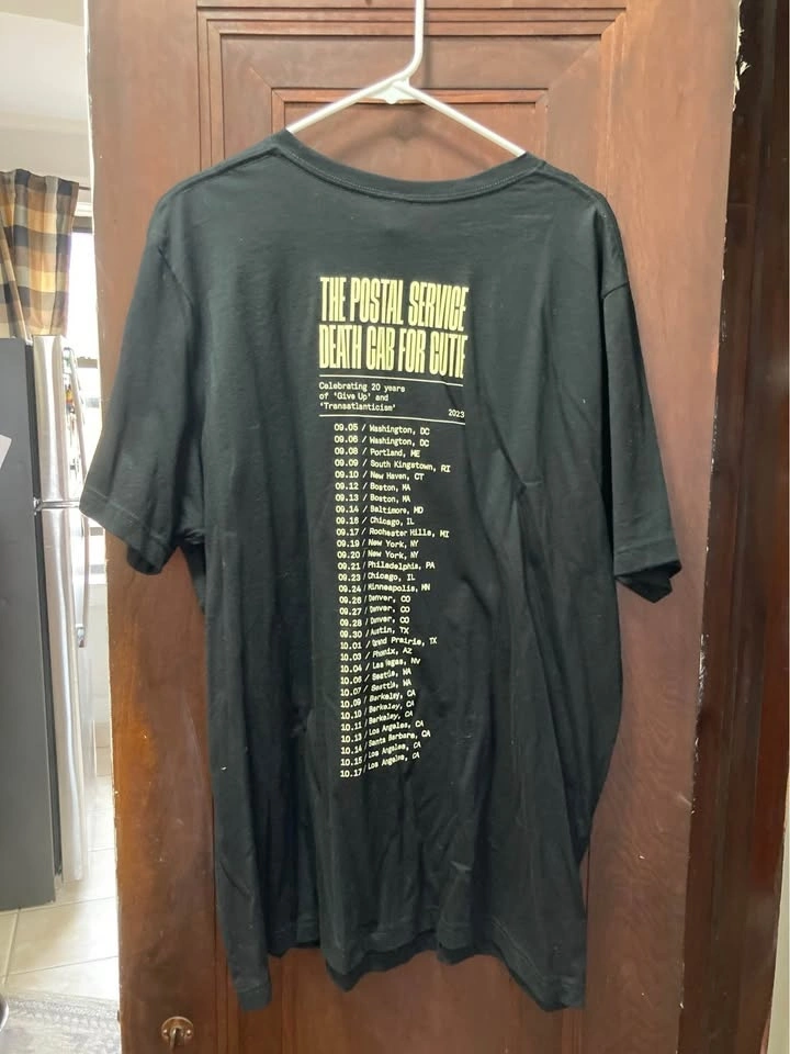 1 / 31 / 3Buy & SellThe Postal Service / Death Cab for Cutie 2XL T-ShirtThe Postal Service / Death Cab for Cutie 2XL T-Shirt$25Black 2XL T-shirt from the Postal Service / Death Cab for Cutie Salt Shed show in 2023. Pickup in Portage Park. Check out my other band shirts!WHERE TO MEETCheck LocationView MapSELLERverifiedGeoffreyPortage Park943 reviews0 chats·0 favorites·4 viewsSEND CHAT TO SELLERHi Geoffrey! I’m interested in your listing.Hi Geoffrey! I’m interested in your listing.Get the Karrot app to chatSign In to chat