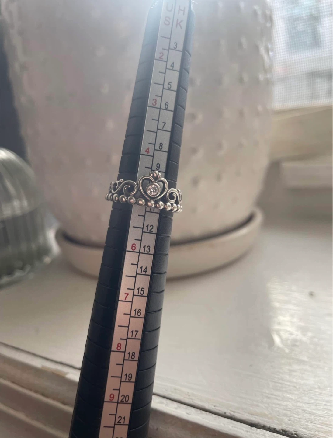 This Pandora ring features a sterling silver tiara design with a center stone. It's a size 5 ring. It's crafted from sterling silver.