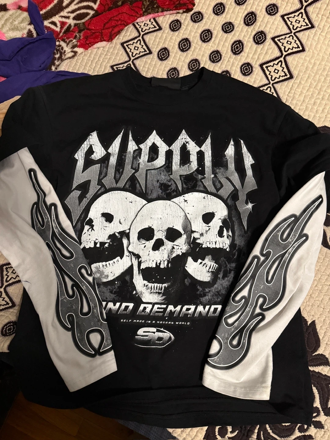 This is a black long sleeve t-shirt from Supply & Demand. It features a graphic print with skulls on the front and flame details on the sleeves. The shirt is made of cotton.