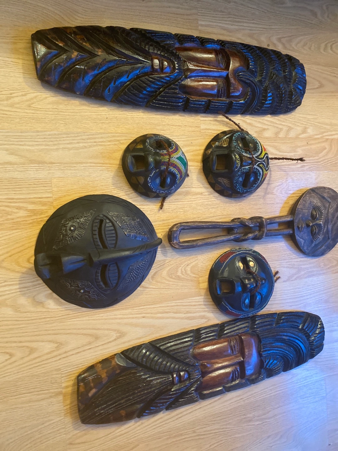 Set of various carved wooden masks. Different sizes and styles. Some masks feature colorful beading. Great for home decor or collectors.