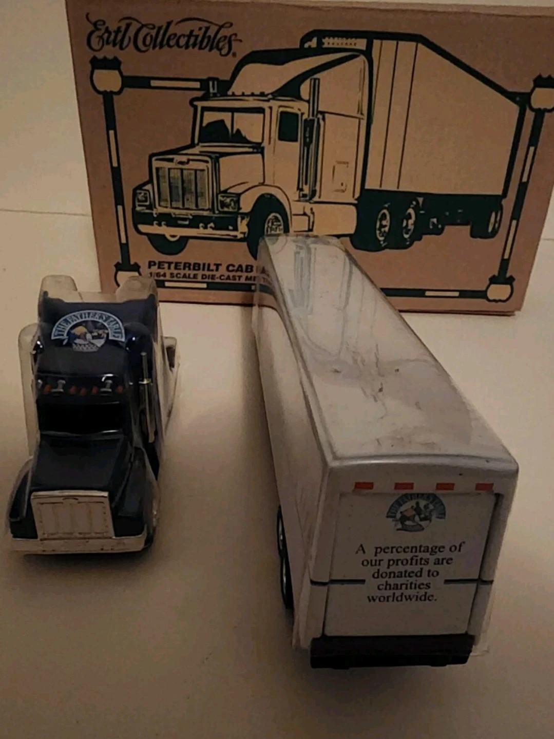 This is a 1/64 scale die-cast metal replica of a Peterbilt cab with a trailer from Ertl Collectibles. The trailer features text stating 'Sharing the bounty of life' and 'A percentage of our profits are donated to charities worldwide.'