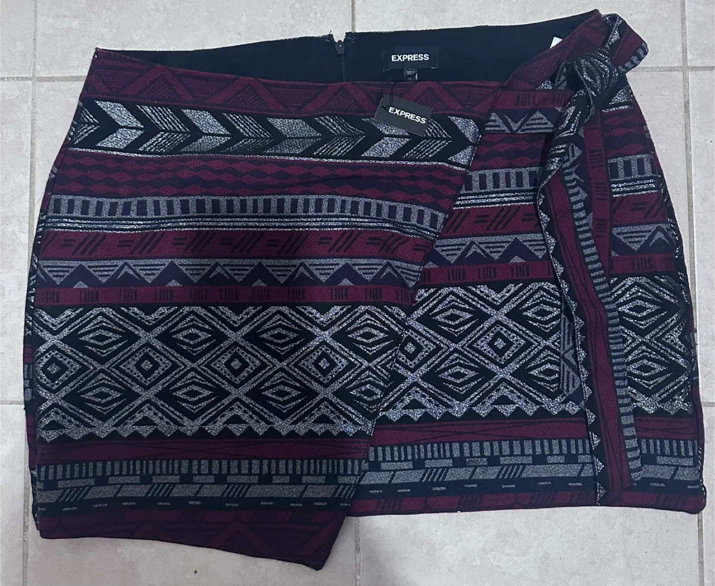 This EXPRESS wrap mini skirt features a burgundy, black, and silver geometric print. It's a size 16. The skirt has a zip closure on the side.