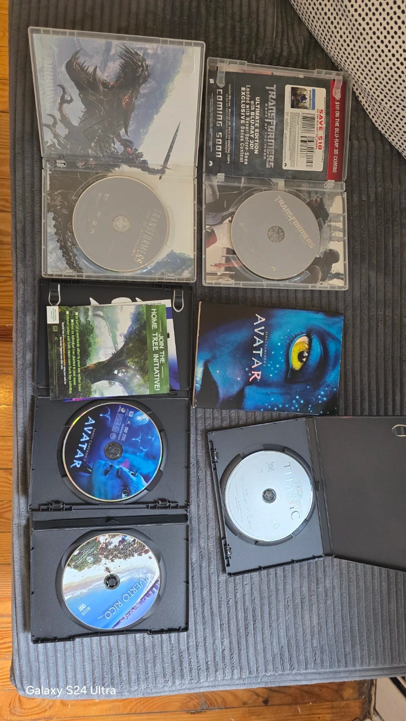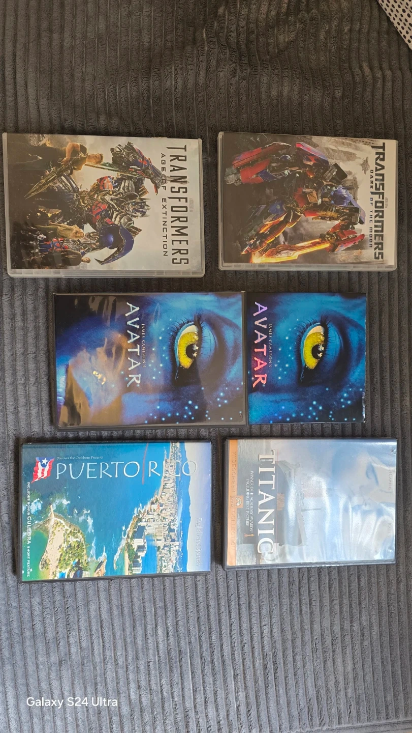 This lot includes five DVDs: Transformers: Age of Extinction, Transformers: Dark of the Moon, Avatar, Titanic, and a Puerto Rico travel documentary. These discs are in cases and appear to be in good condition.