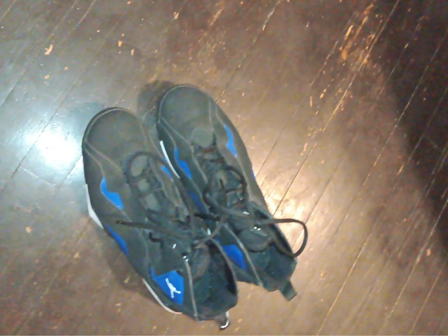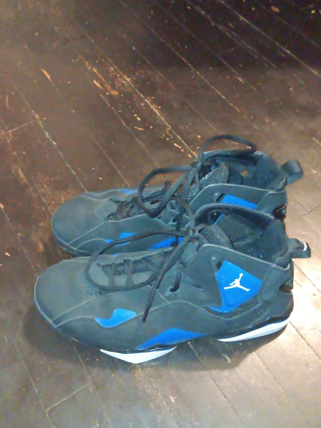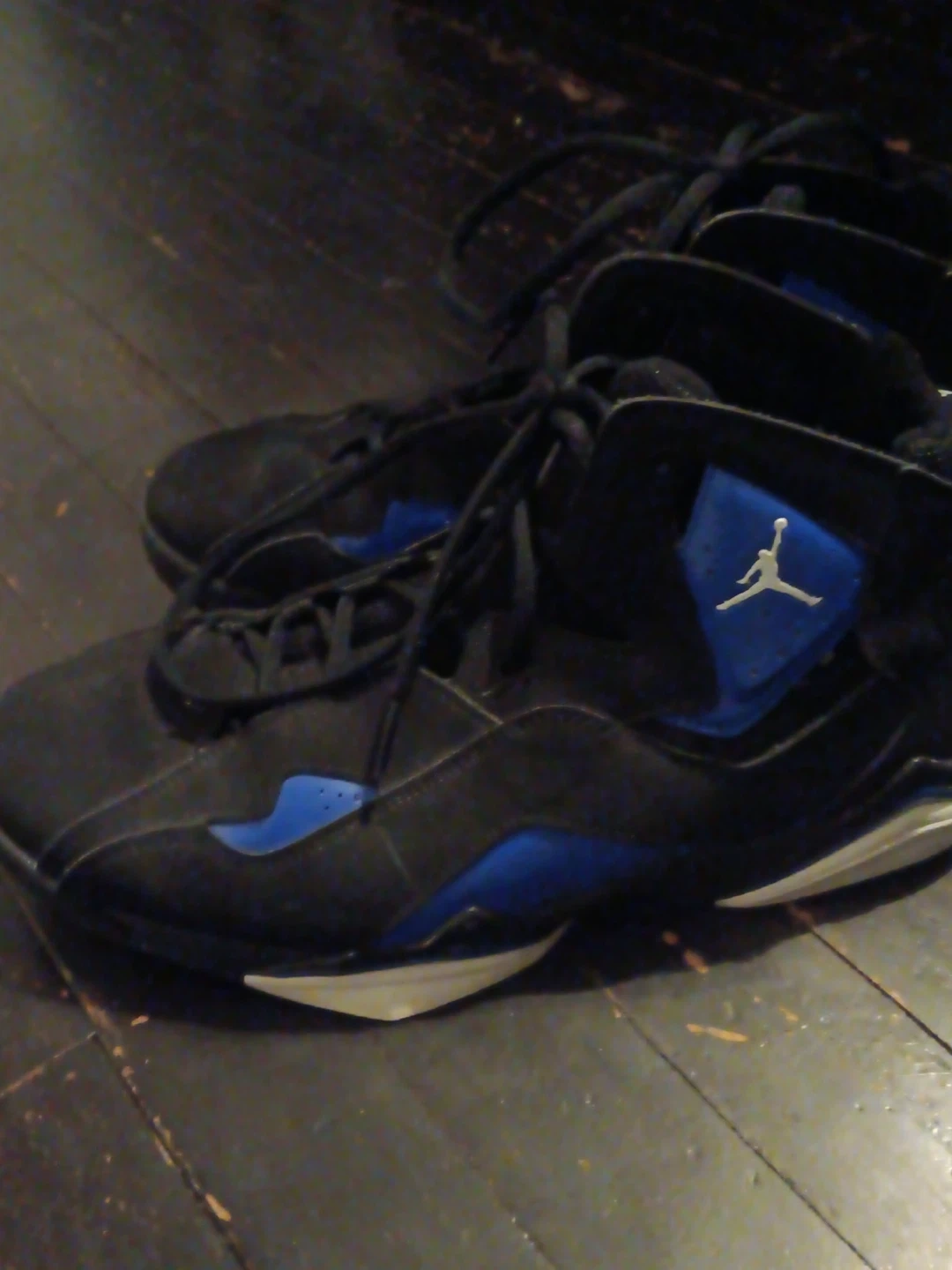 Black and blue Jordan basketball shoes. Lace-up closure. These shoes are perfect for playing basketball.