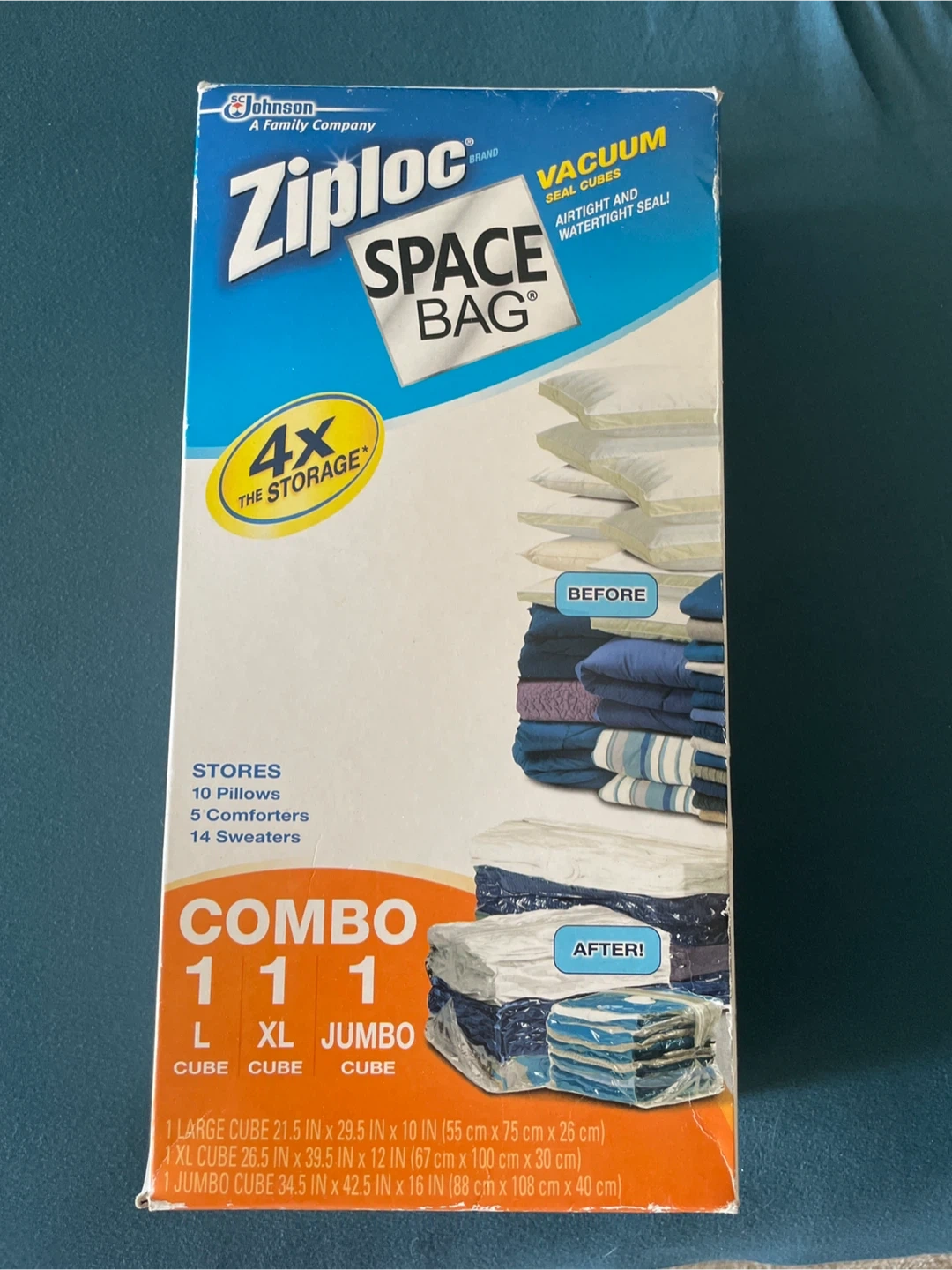 Get organized with this Ziploc Space Bag combo pack! It includes one large, one extra-large, and one jumbo vacuum seal cube. Perfect for storing pillows, comforters, and sweaters, these bags offer 4x the storage space. The large cube measures 21.5 x 29.5 x 10 inches, the XL cube is 26.5 x 39.5 x 12 inches, and the jumbo cube is 34.5 x 42.5 x 16 inches. They're airtight and watertight, keeping your items safe and secure
