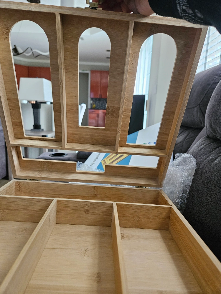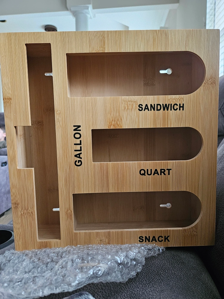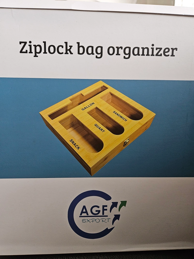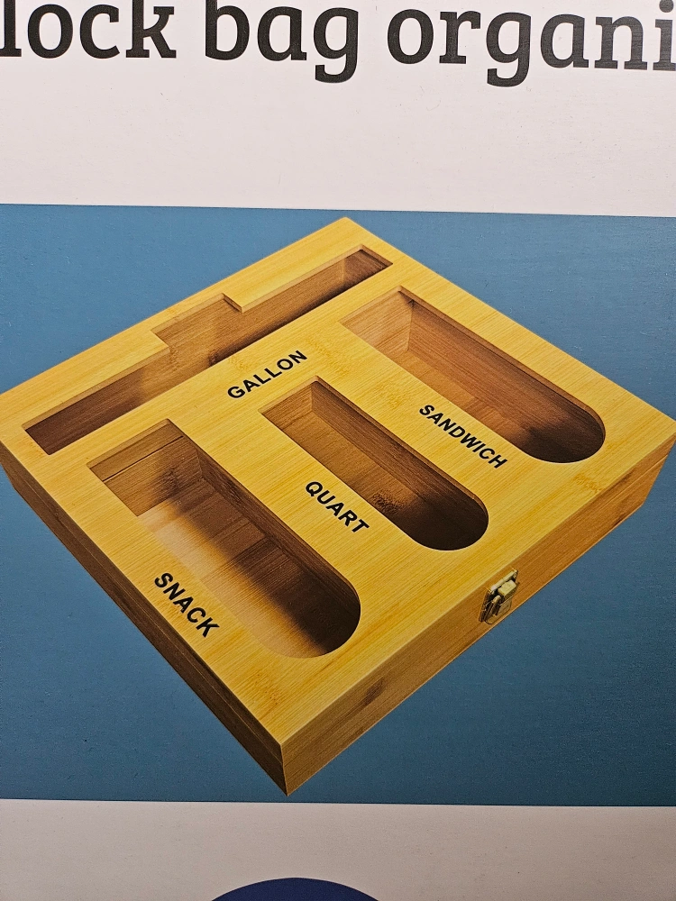 Keep your kitchen drawers tidy with this bamboo ziplock bag organizer! It has compartments for snack, quart, sandwich, and gallon bags. It's in great condition brand new and in box and ready to help you get organized