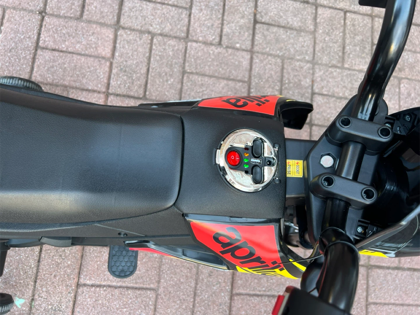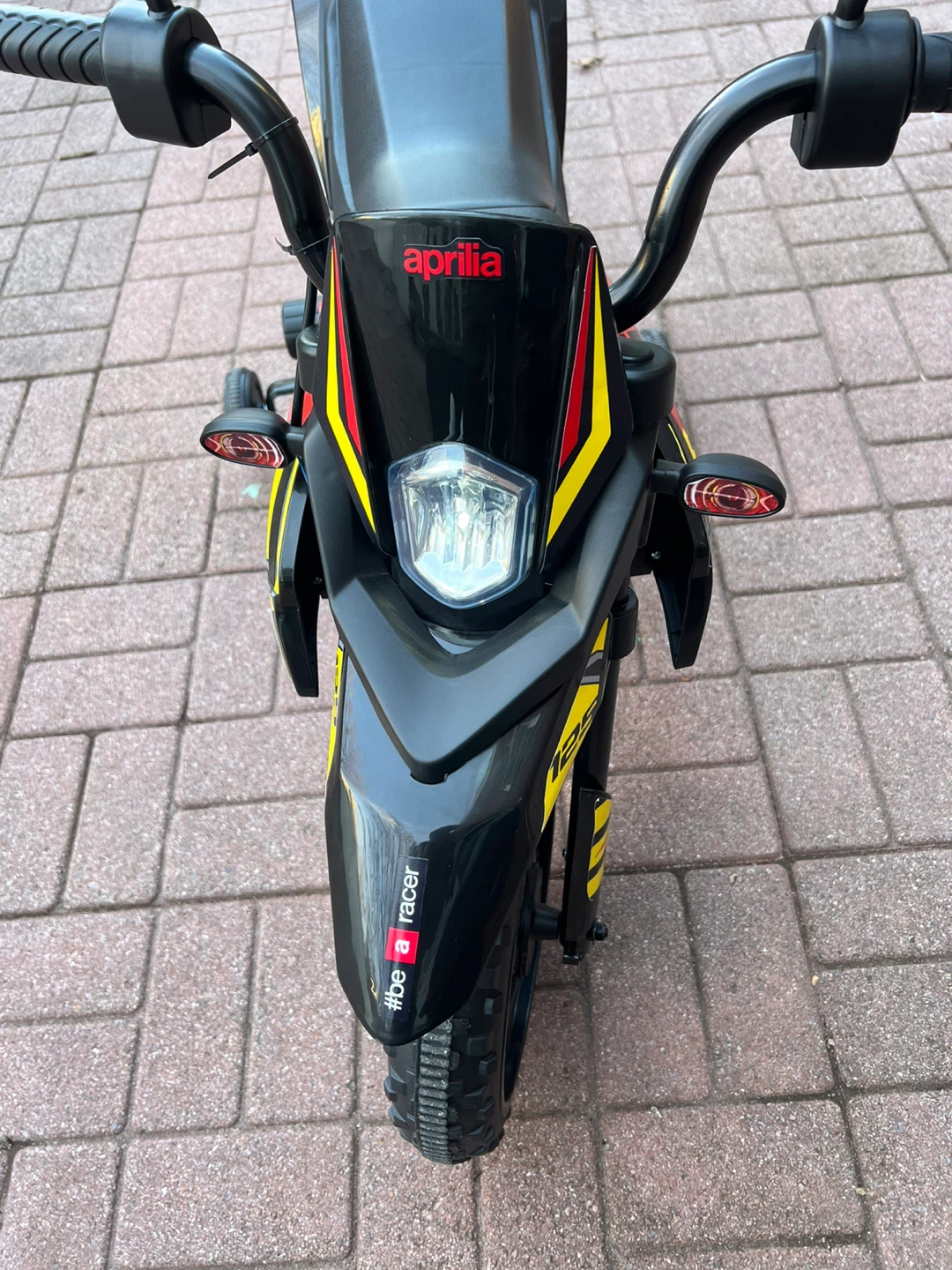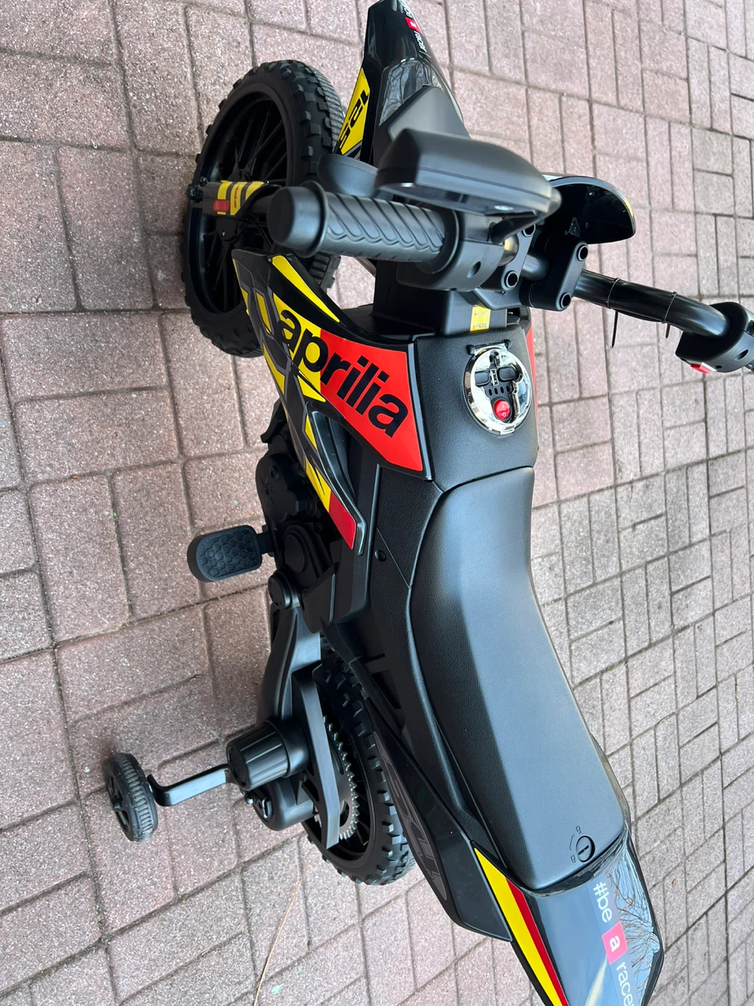 Selling a fun Aprilia electric ride-on motorcycle for kids! It's in great condition and ready for a new little rider. Perfect for outdoor adventures and learning to balance. It has a cool design with Aprilia logos and sporty colors!