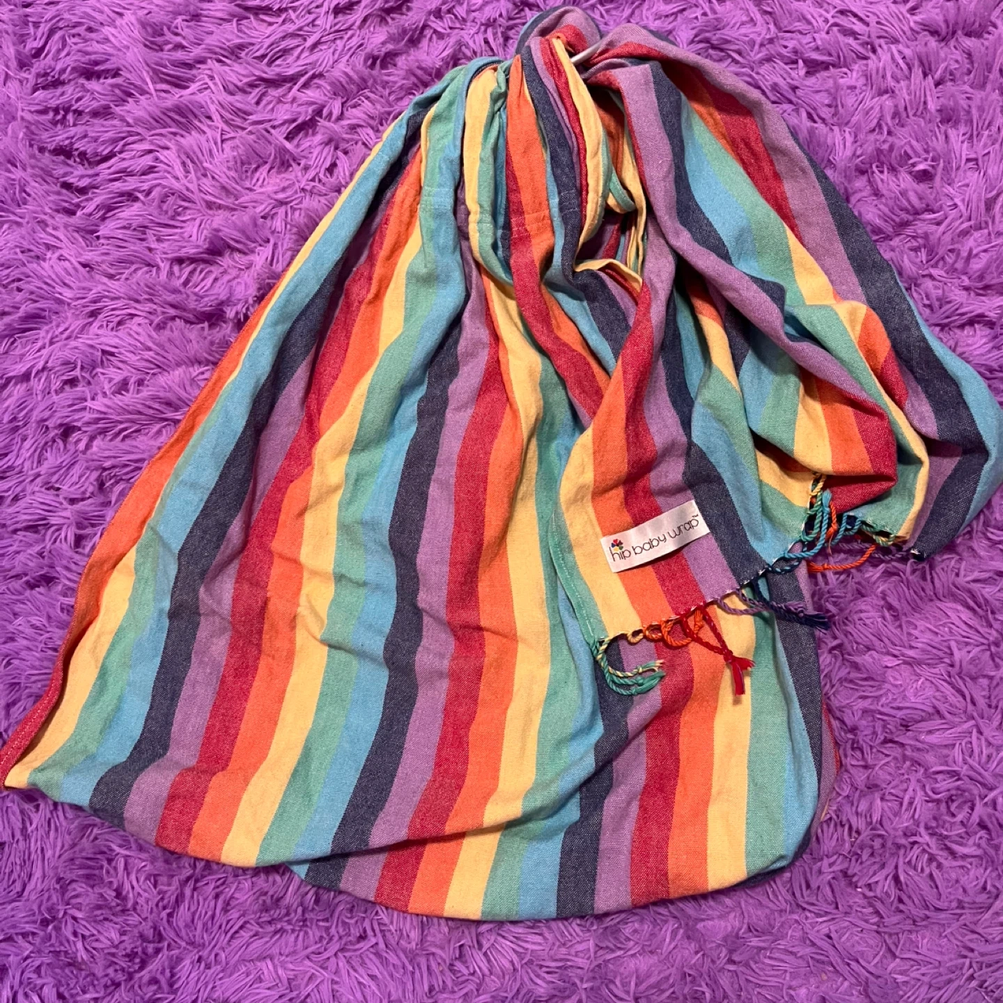 This is a Hip Baby Wrap baby carrier in a rainbow stripe pattern. It's made from a soft, breathable fabric, perfect for comfortable babywearing. This wrap is great for keeping your little one close while keeping your hands free!