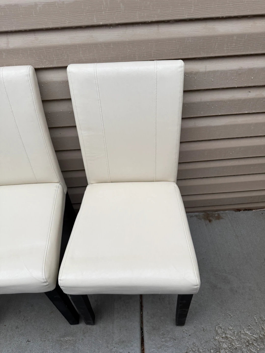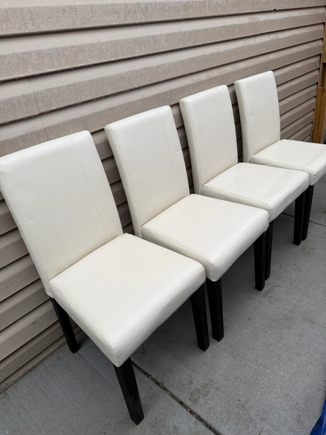 Selling a set of four dining chairs. They have a clean, modern look with white seats and dark legs. Perfect for updating your dining space!
