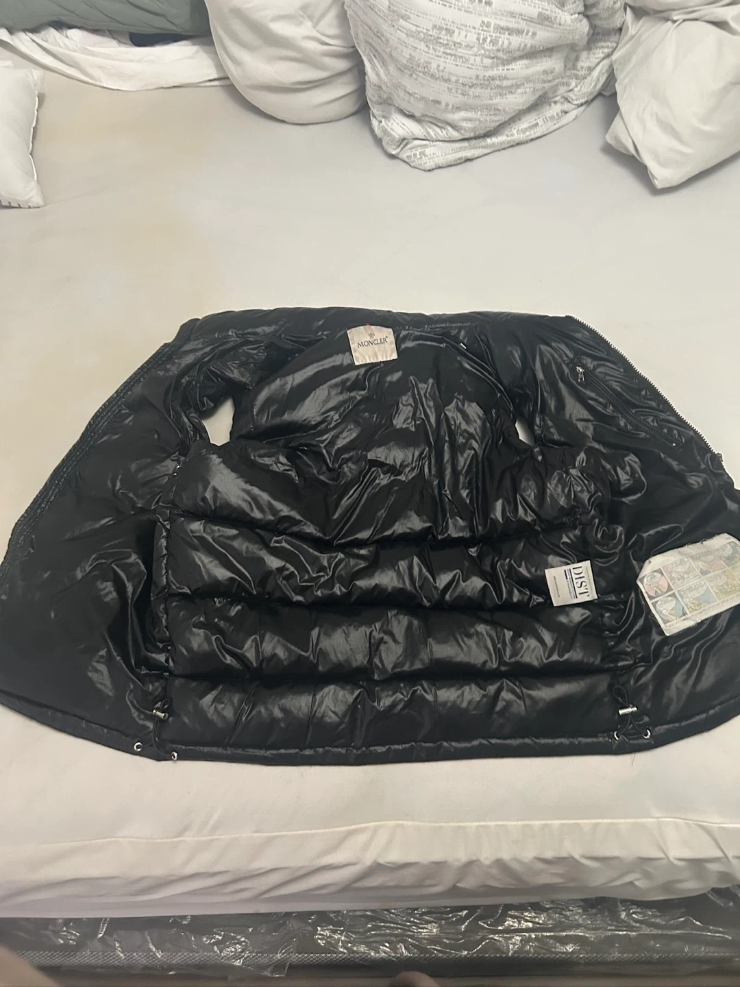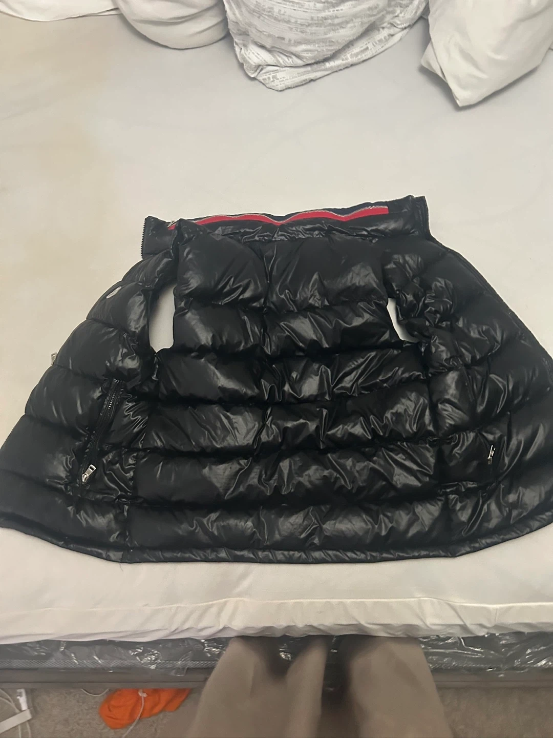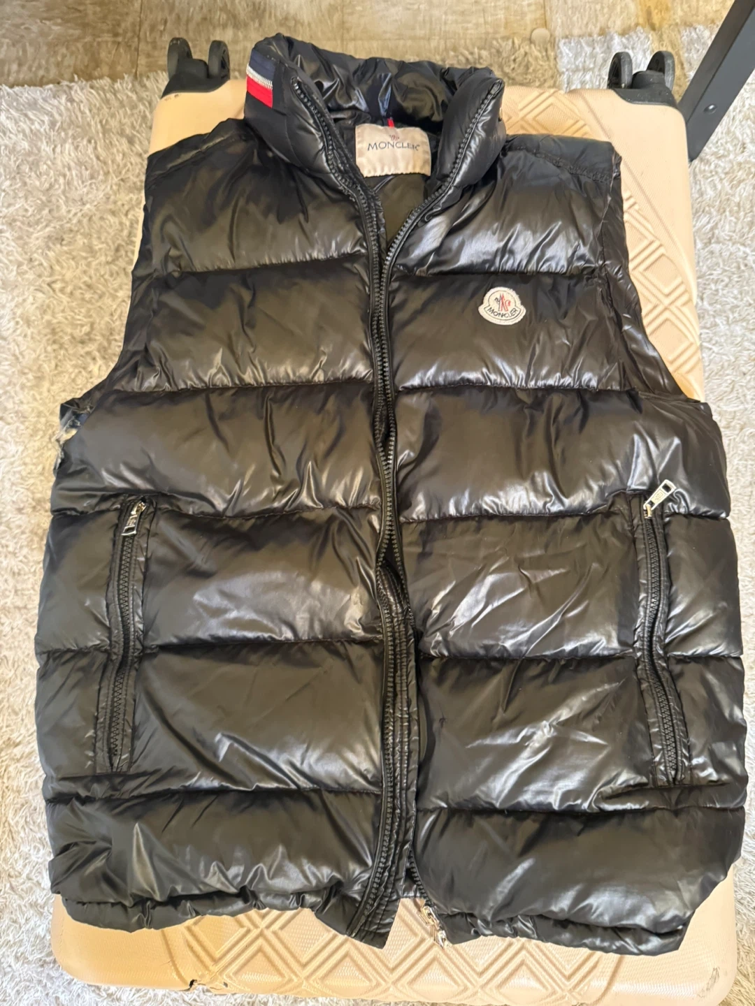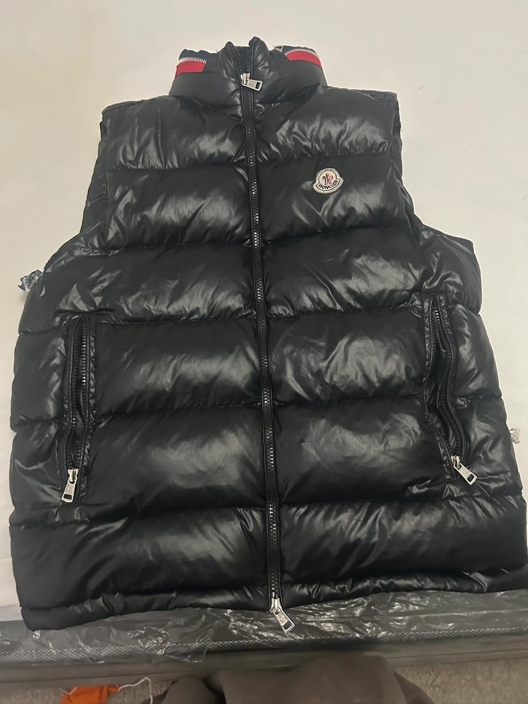 This is a Moncler puffer vest in black. It's a sleeveless jacket with a full zip front. Features zippered pockets on the front. Perfect for layering during cooler weather!