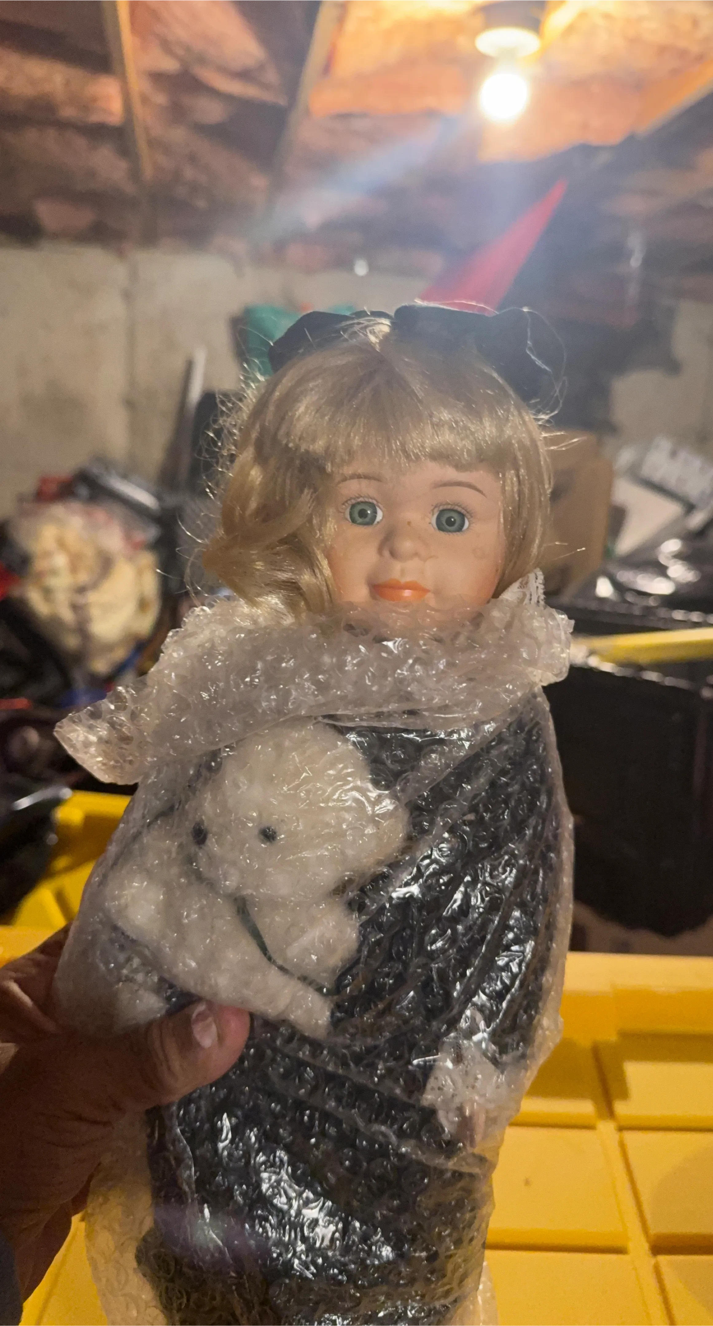 This is a vintage porcelain doll with a teddy bear inside the plastic wrap. It features blonde hair and blue eyes. Great for collectors or as a decorative piece!