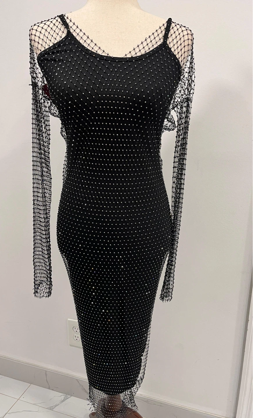 Selling a black dress with a rhinestone design and mesh overlay! It's in great condition and ready for a new home. The dress has a unique and stylish look that's perfect for a night out or special occasion
