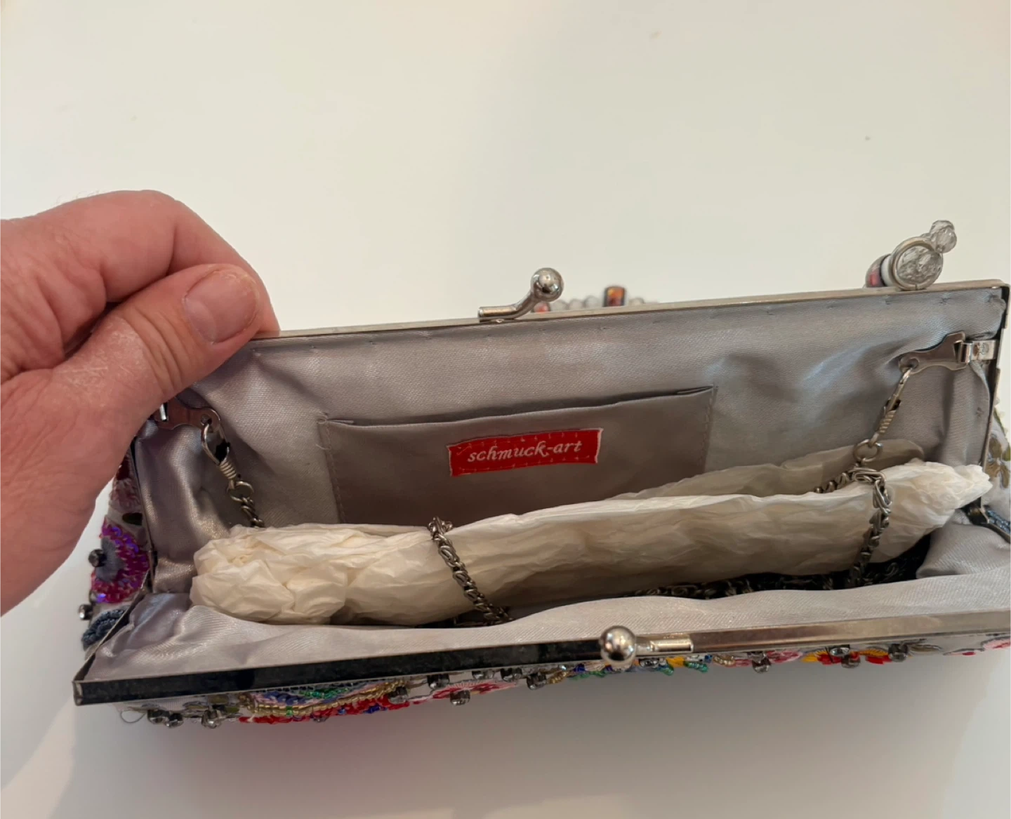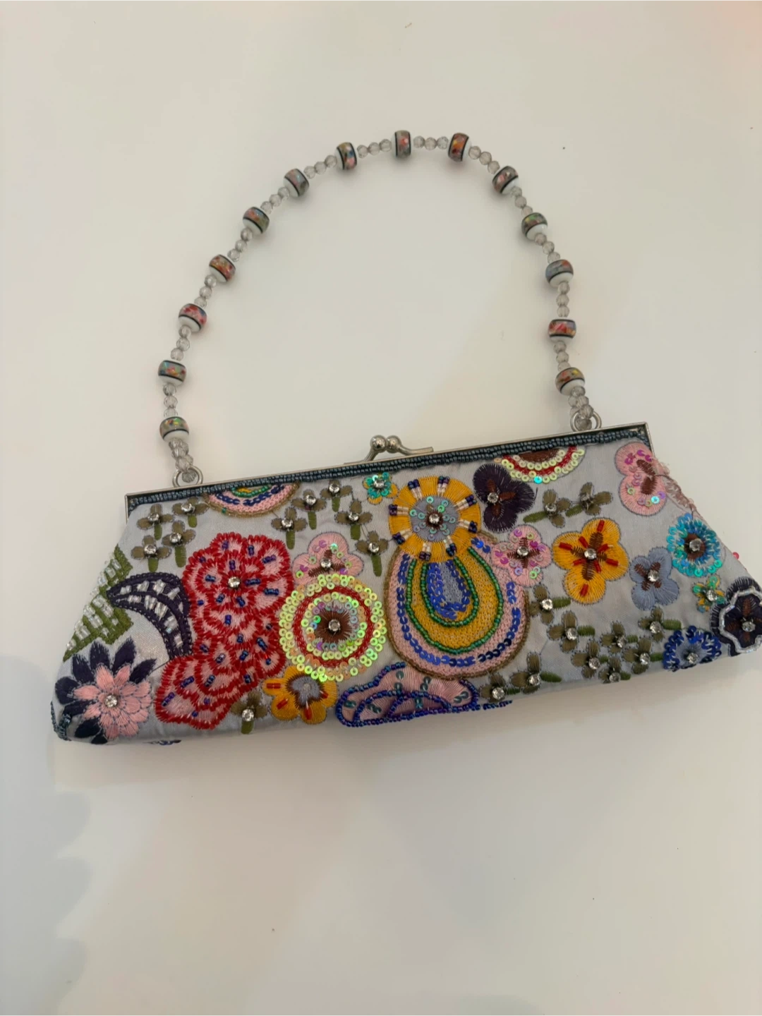 This sparkling clutch features vibrant floral embroidery and beadwork. It has a satin lining and a delicate beaded strap. A beautiful accessory for special occasions!