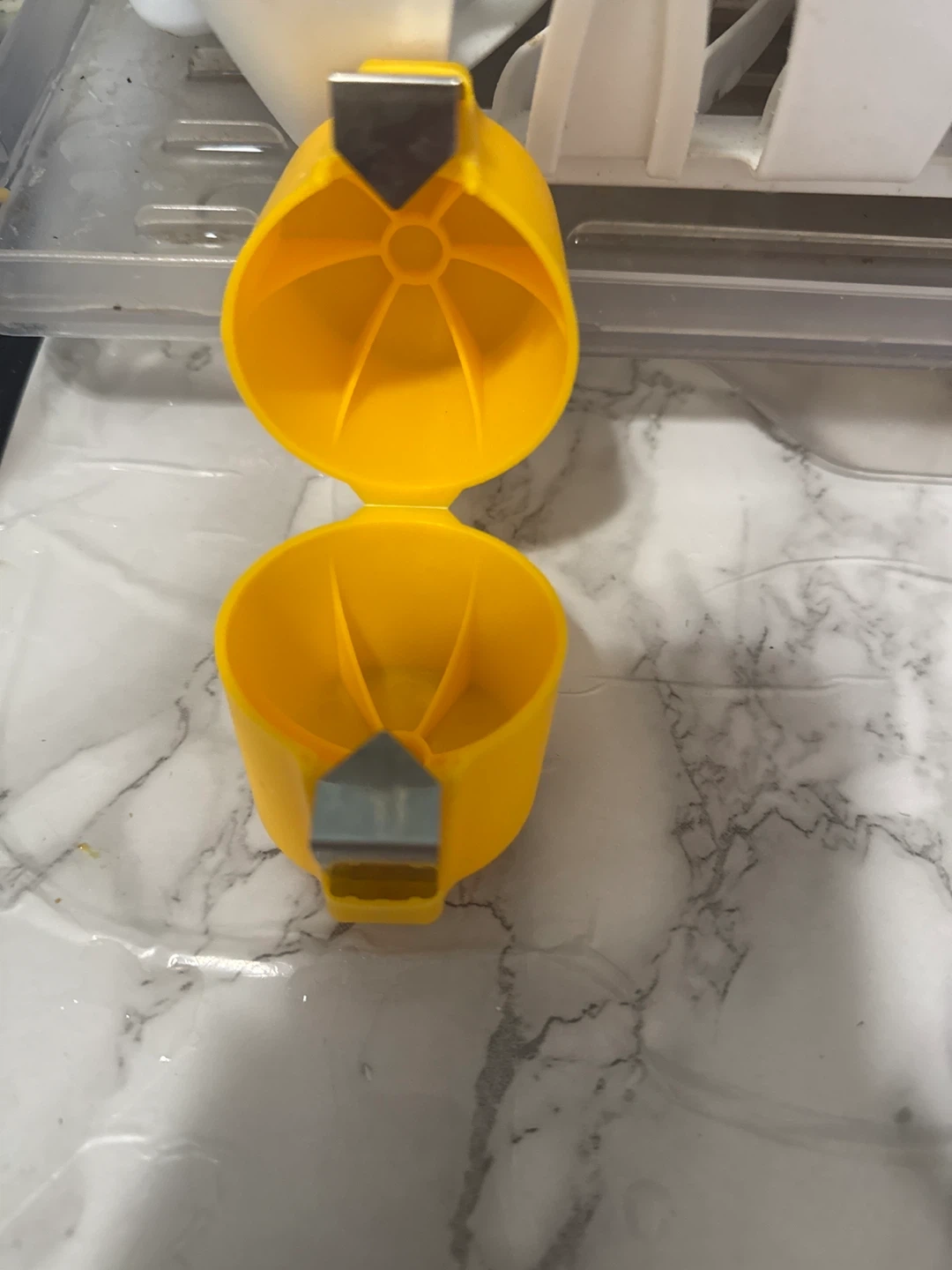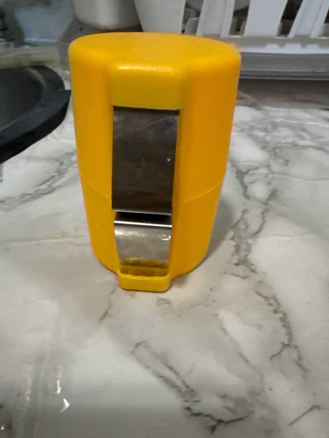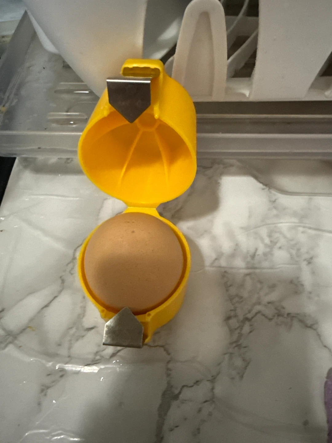 This yellow kitchen gadget slices and holds eggs. It features a metal cutting mechanism. Its compact design makes it easy to store.