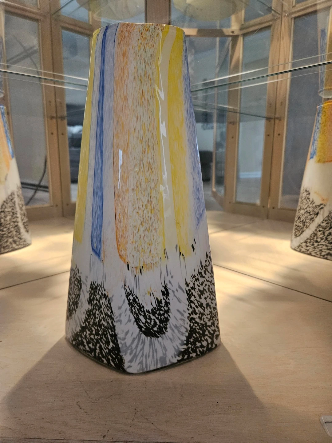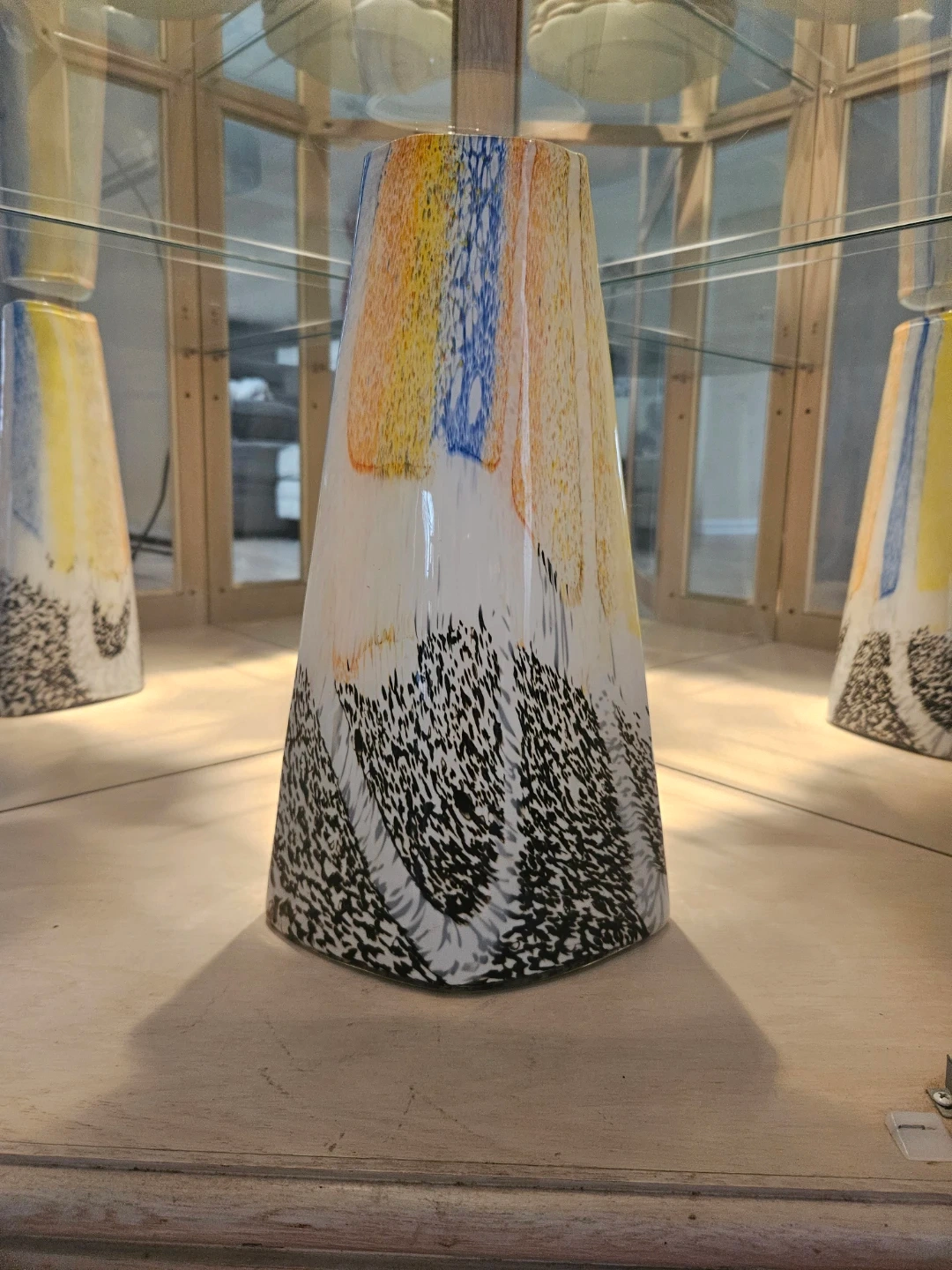 This striking glass vase boasts a unique, conical shape and a vibrant abstract pattern. It features bold stripes of blue, yellow, and orange over a white base, with a speckled black and gray design near the bottom. Its artistic flair makes it a standout decorative piece.