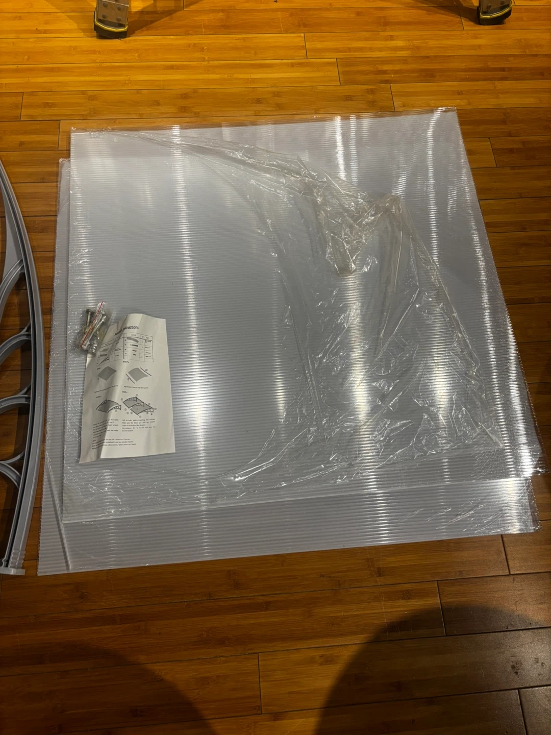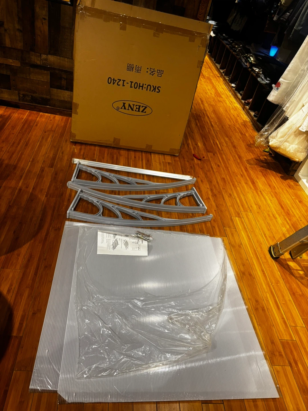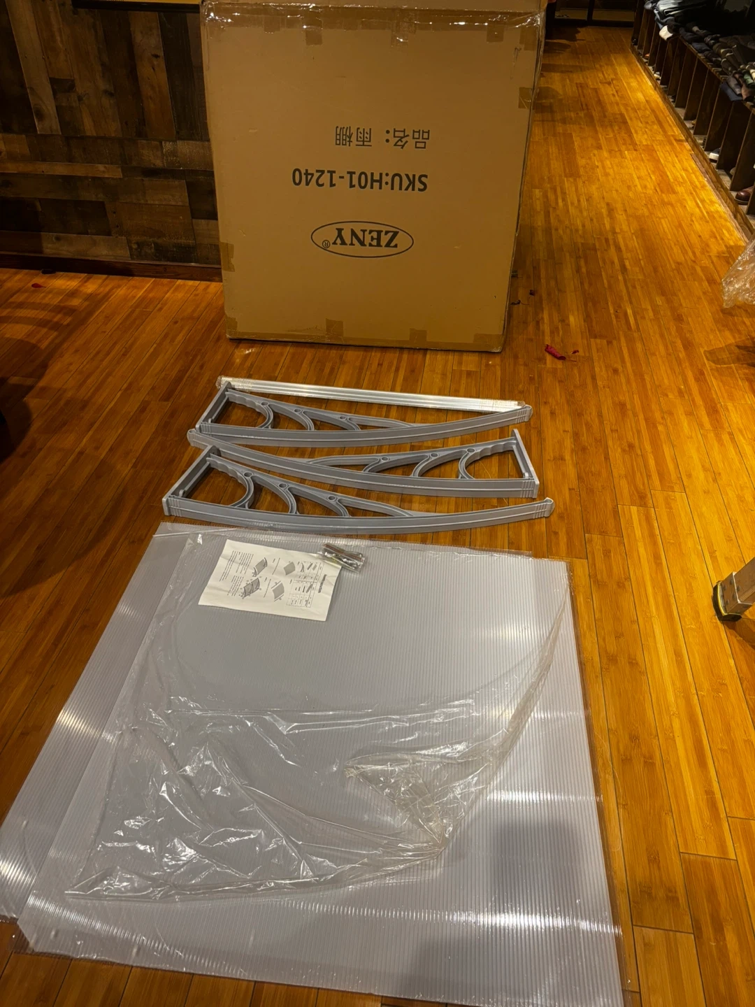 Zeny door canopy kit. Includes grey brackets, clear plastic panels, and hardware. SKU: H01-1240. Protects your entryway from the elements!