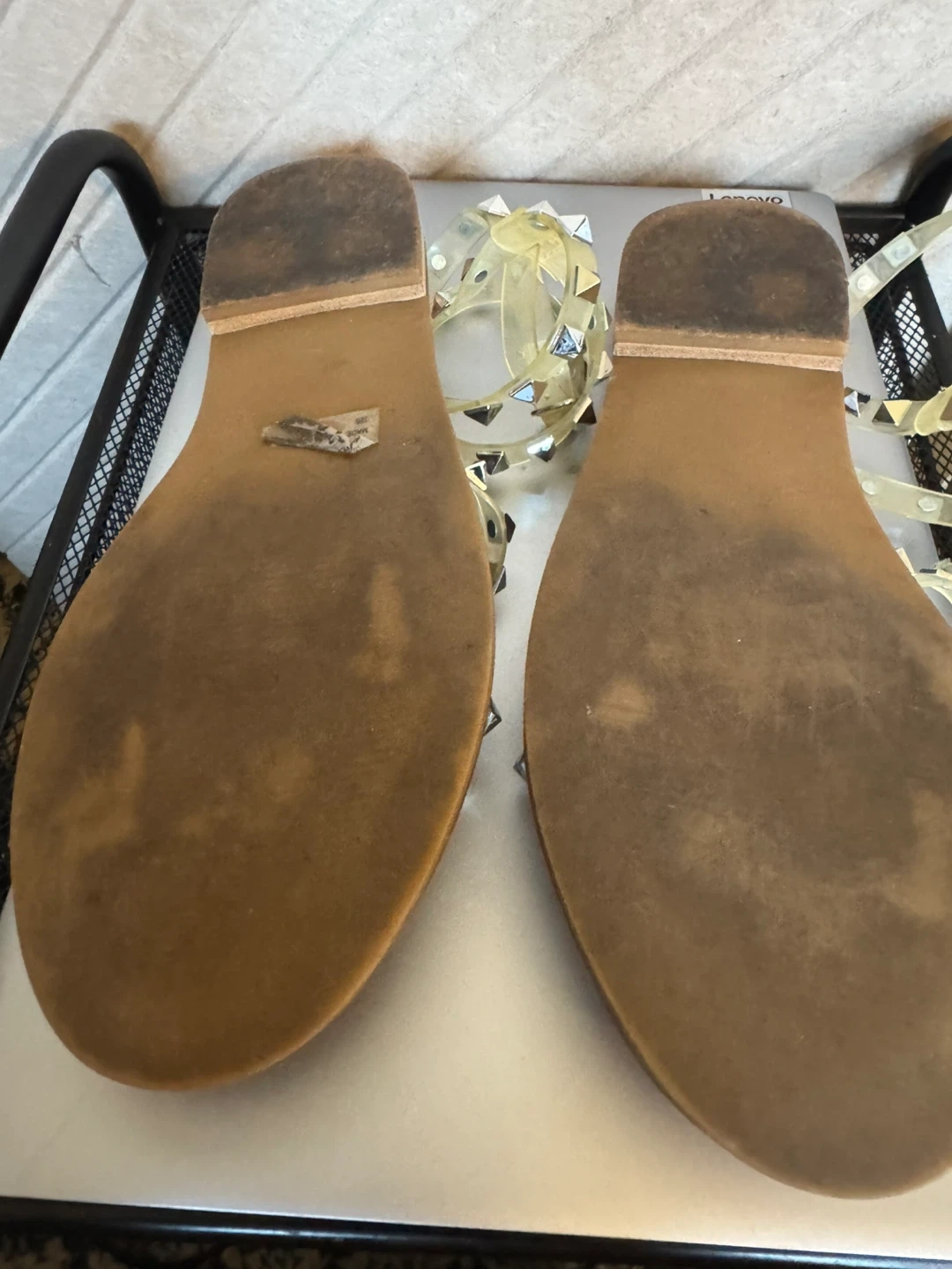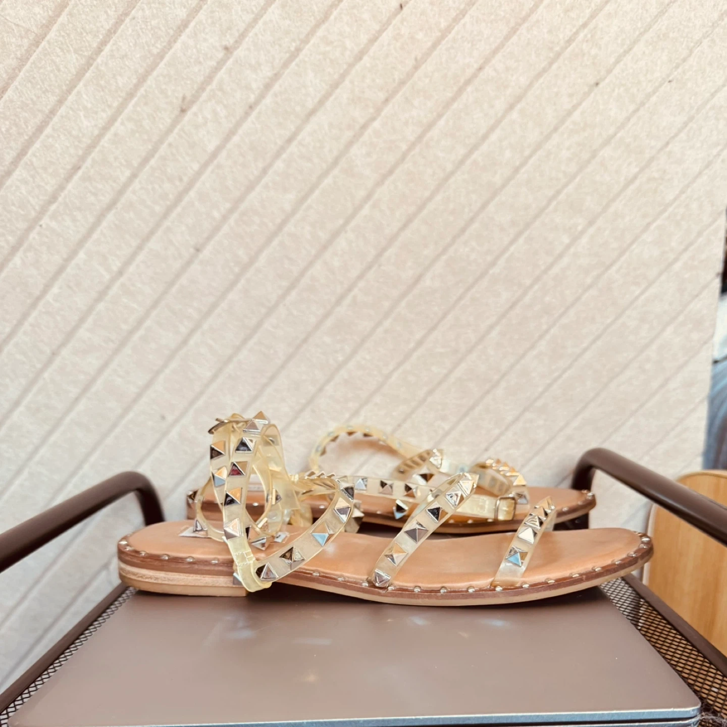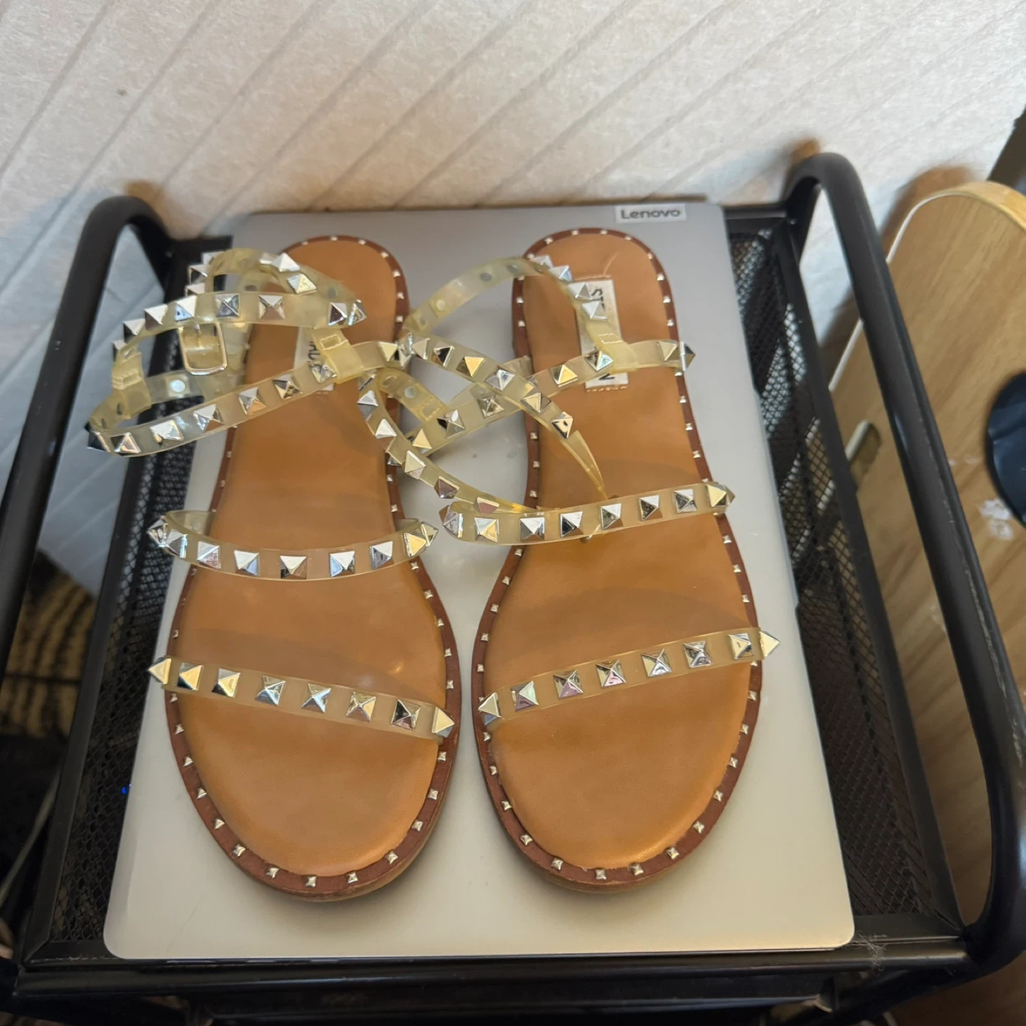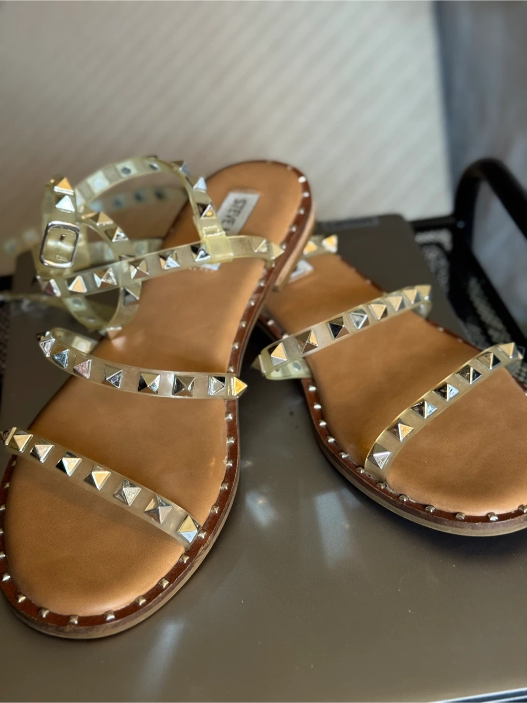 Steve Madden studded clear strap flat sandals. Features multiple clear straps with silver-tone stud details. Buckle closure for adjustable fit.