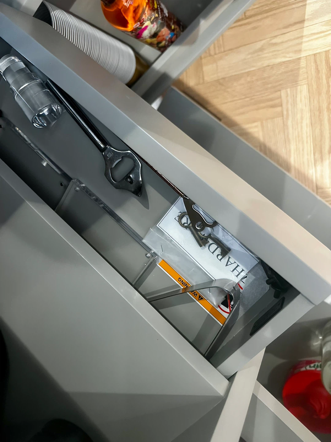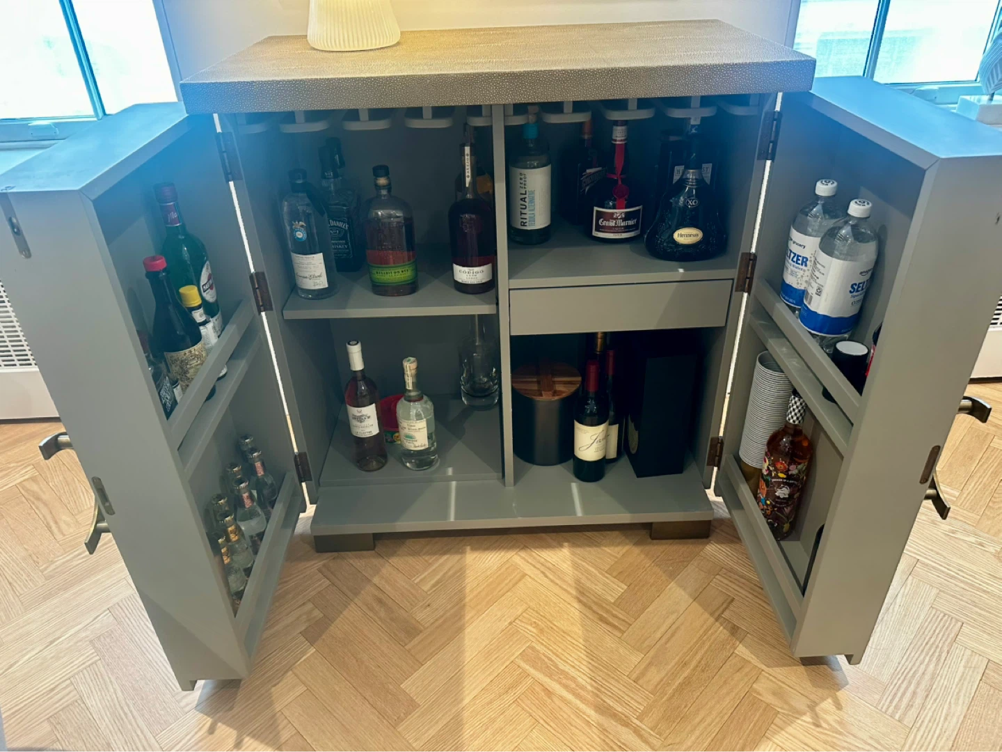 Inside, storage for bottles, shelving for bar tools, and racks for stemware.