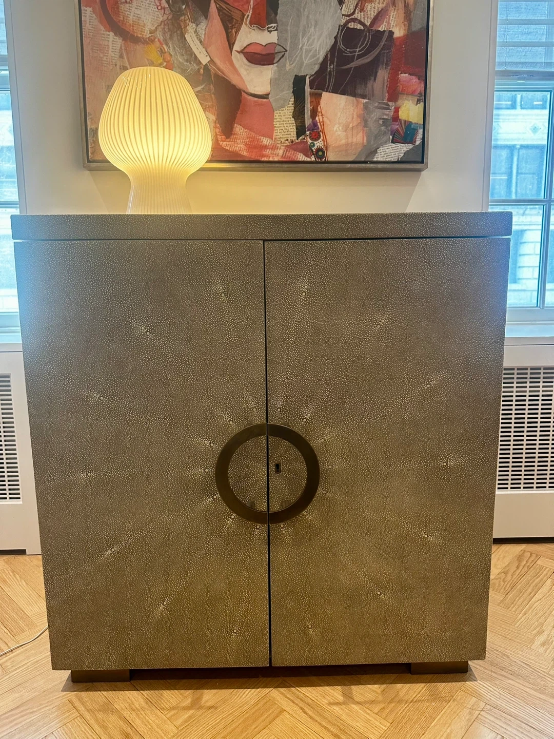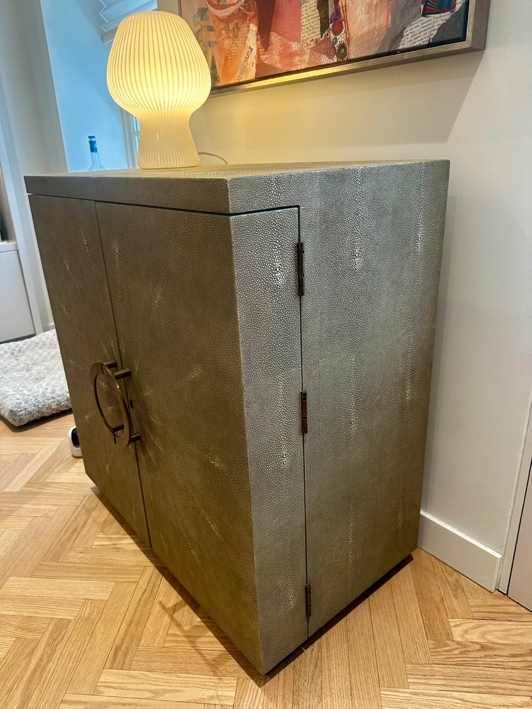 Rich grey ish shagreen like material with brass hardware that is as pictured in